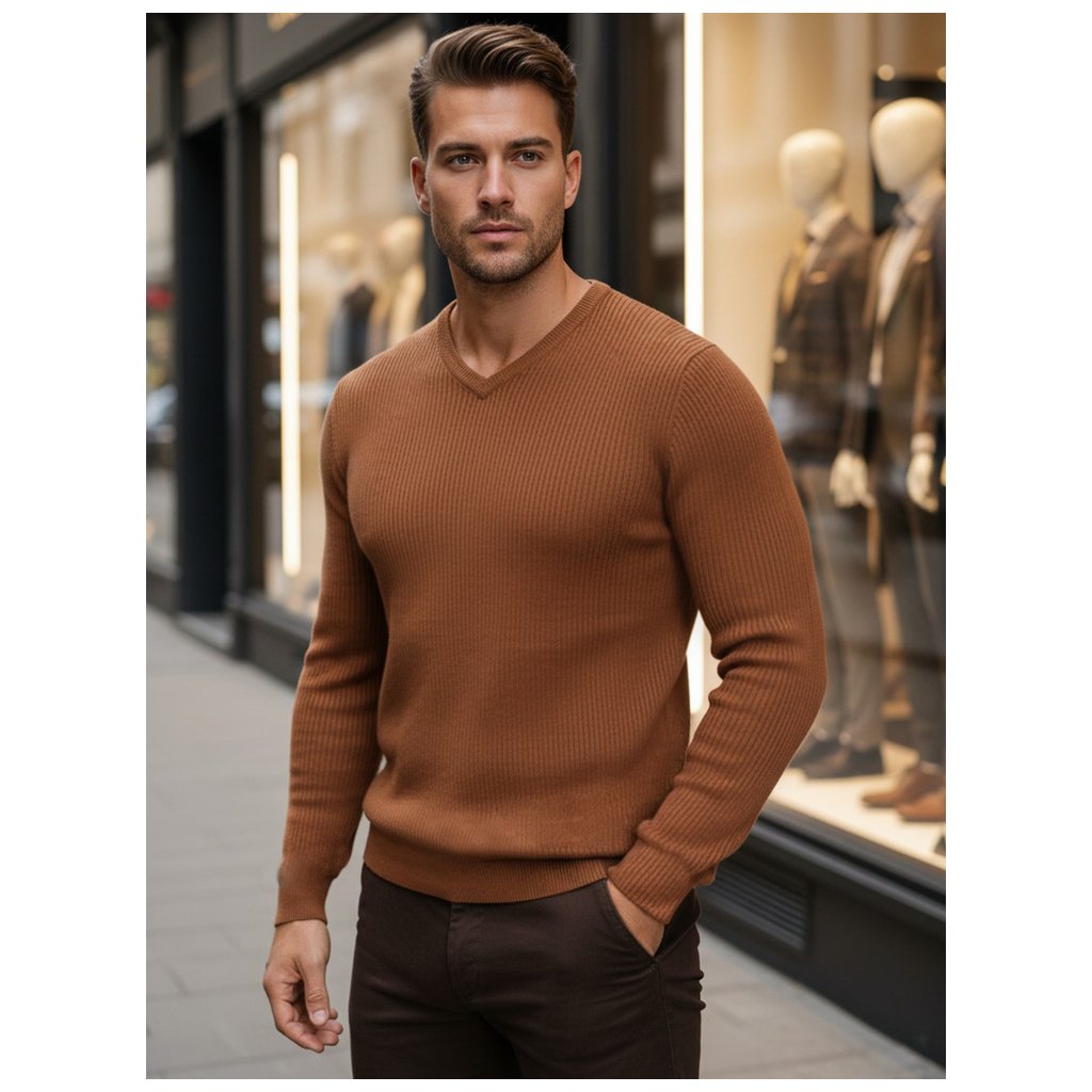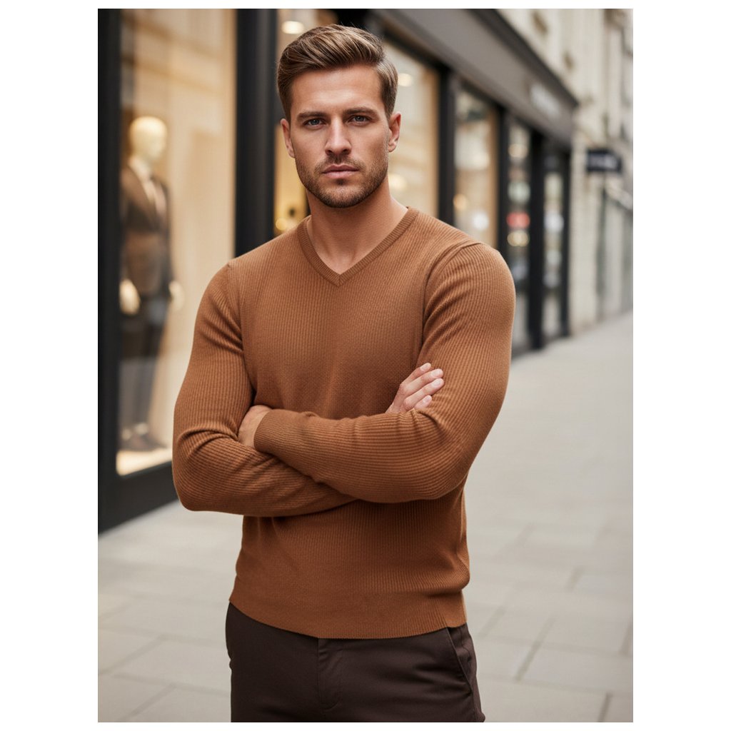 Pánský svetr s decentním výstřihem do V, který dokonale lichotí postavě. Pružný materiál zajišťuje pohodlí a minimalistický design doplní jakýkoli outfit, ať už pro každodenní nošení nebo pro zvláštní příležitosti. Tento praktický a stylový kousek dodá každému outfitu charakter.