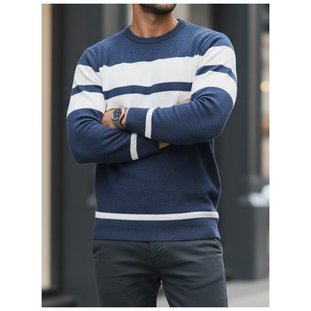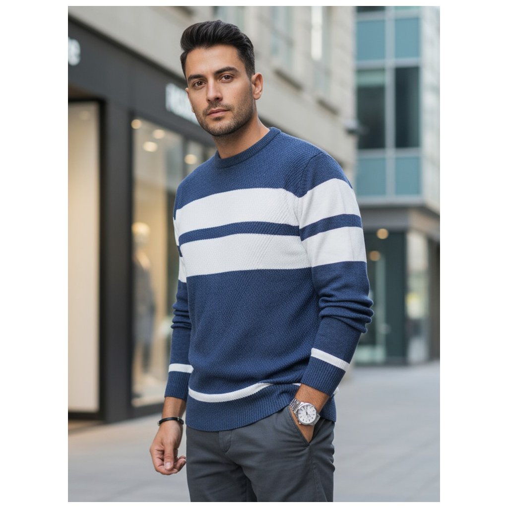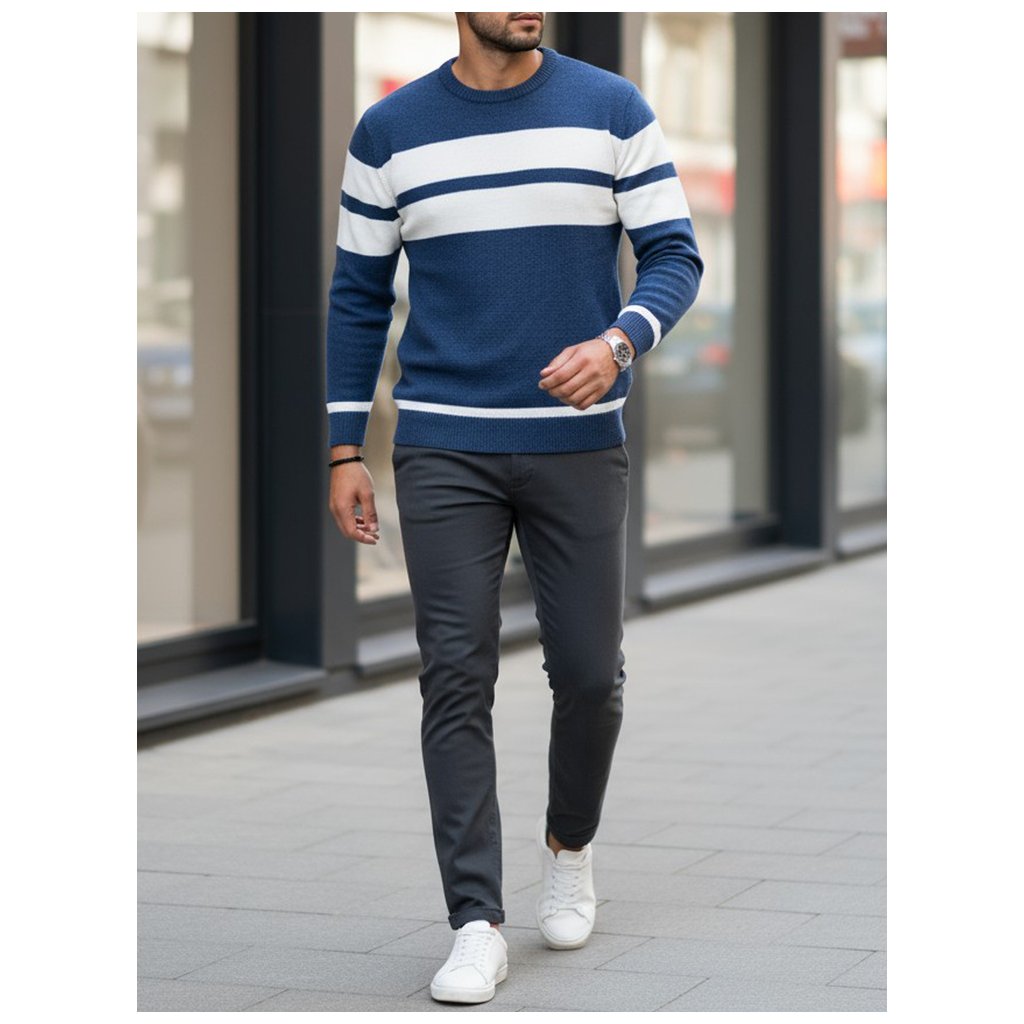 Pruhy v kontrastních odstínech zdůrazňují moderní charakter svetru.