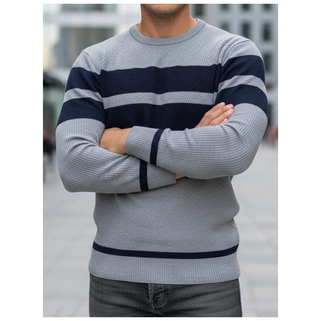 Tento svetr klasického střihu s kulatým výstřihem je vyroben z měkké, pružné pleteniny. Pruhovaný vzor v odstínech černé a šedé mu dodává všestranný vzhled, ideální pro každodenní styling. Strukturovaná vazba dodává texturu a zdůrazňuje jeho moderní vzhled.