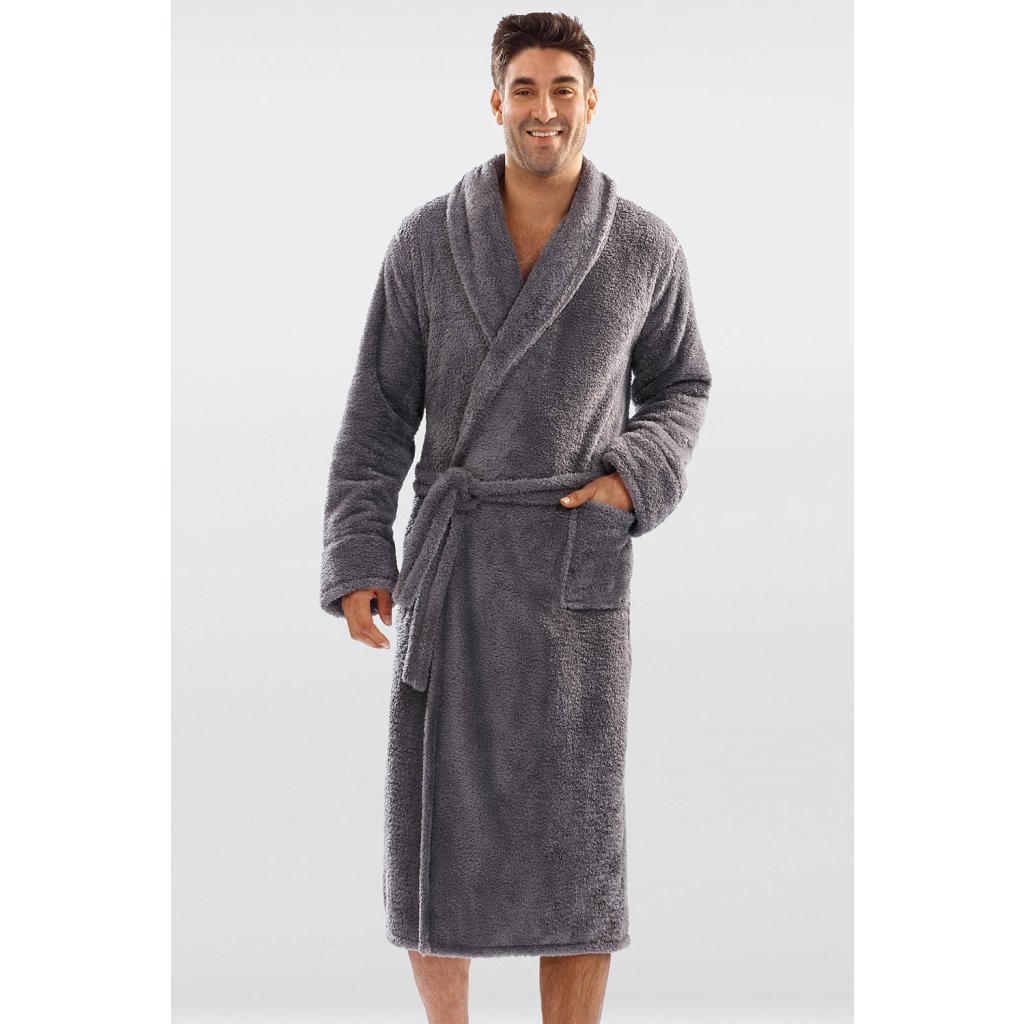 Pánský župan značky Dkaren v červené barvě. Je huňatý, ušitý z měkkého materiálu zn. LAMA, má šálový límec, pásek a na bocích našité kapsy. Rukávy jsou na konci zakončené manžetou.