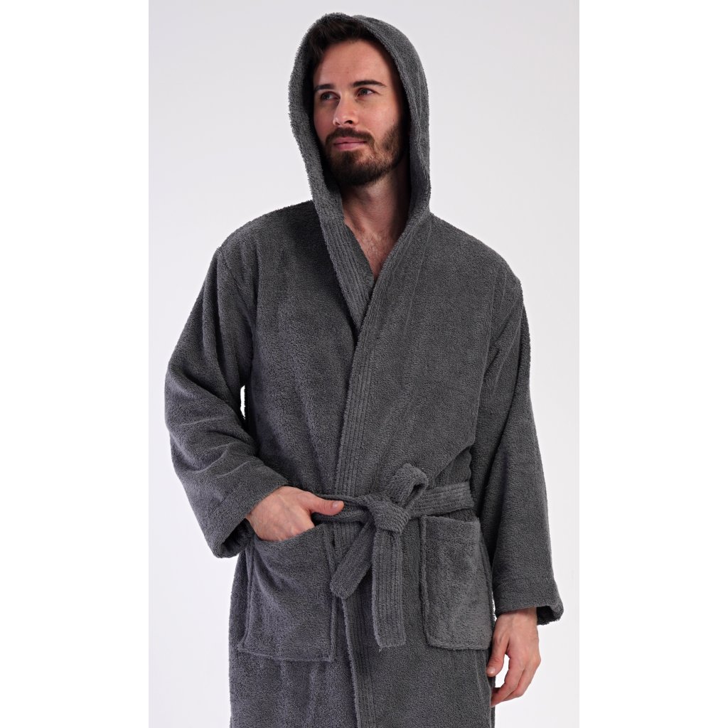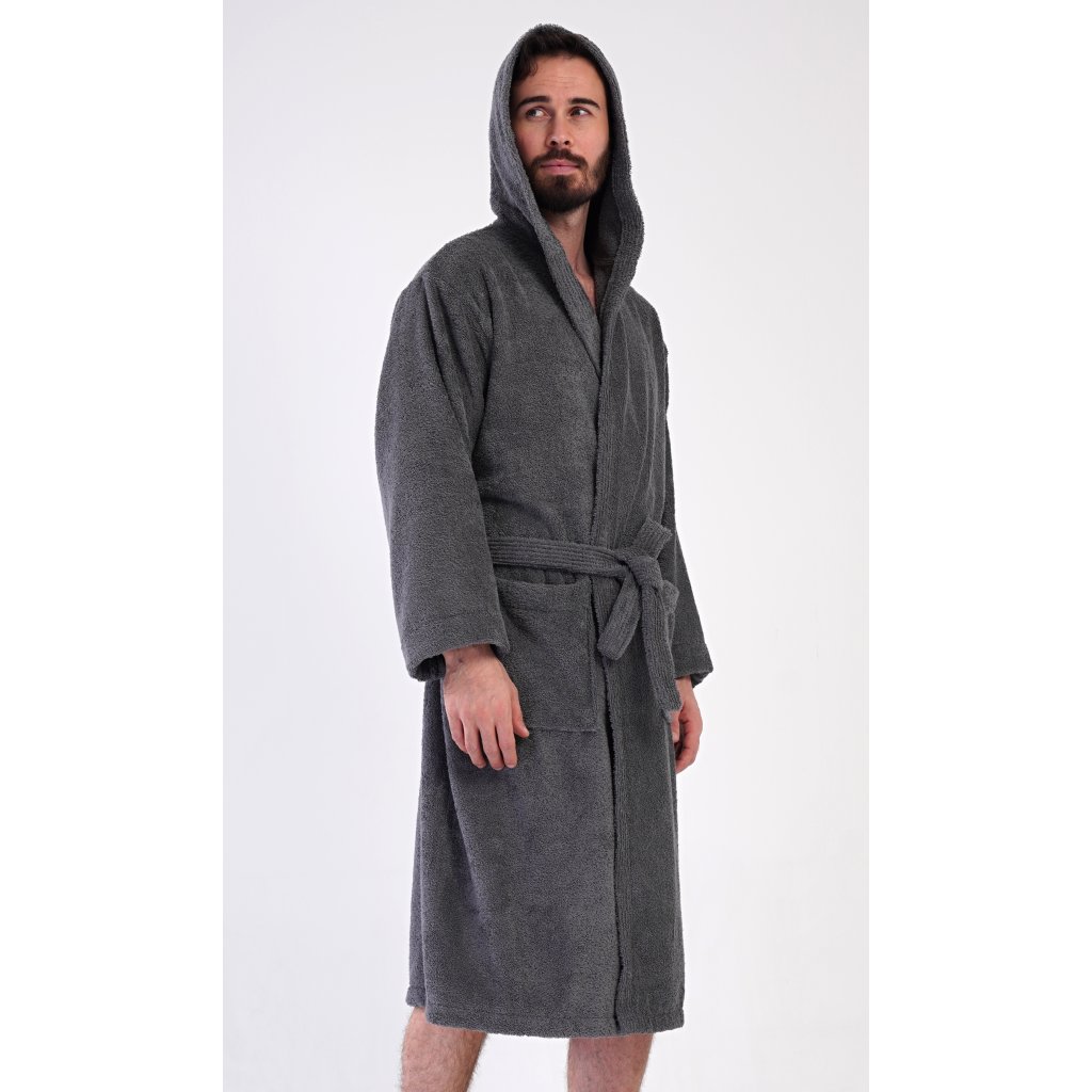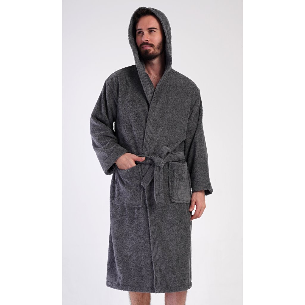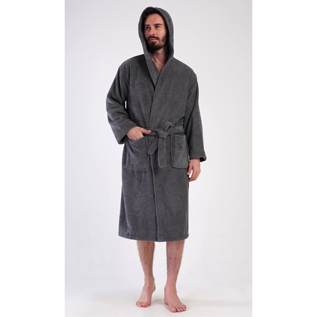 Pánský bavlněný froté župan s kapucí Alex. Pánský dlouhý župan s kapucí a páskem ke stažení je vhodný po koupeli i na povalování se doma na gauči. Froté župan má praktické kapsy, které oceníte při návštěvě wellness. Použitý bavlněný materiál je příjemný a poddajný na dotek.