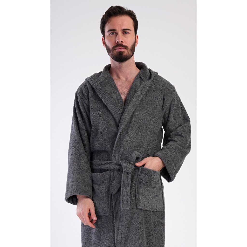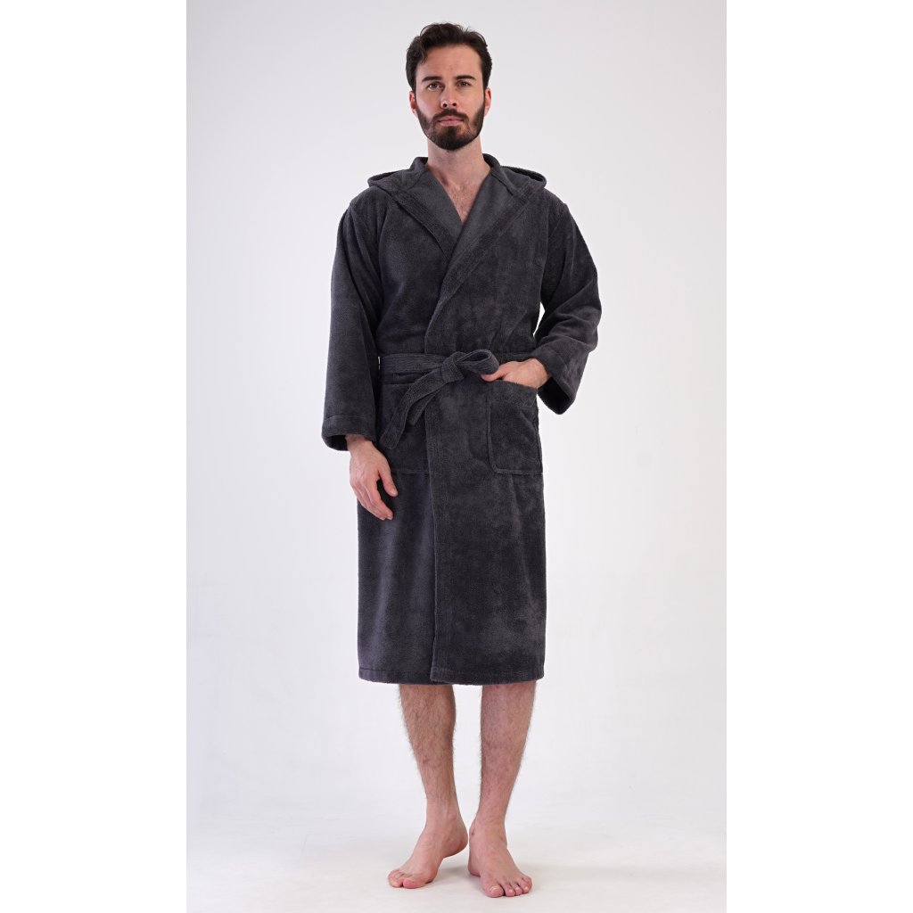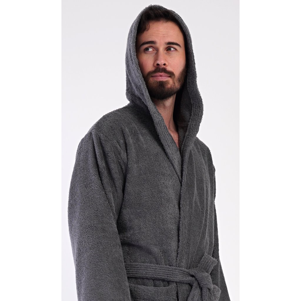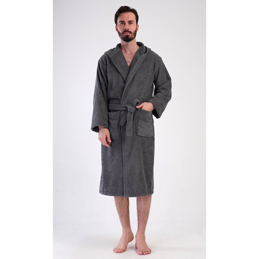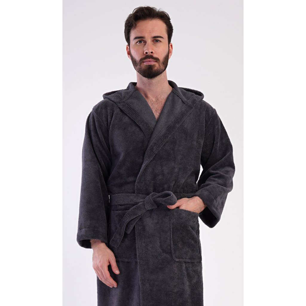 Pánský bavlněný froté župan s kapucí Alex. Pánský dlouhý župan s kapucí a páskem ke stažení je vhodný po koupeli i na povalování se doma na gauči. Froté župan má praktické kapsy, které oceníte při návštěvě wellness. Použitý bavlněný materiál je příjemný a poddajný na dotek.