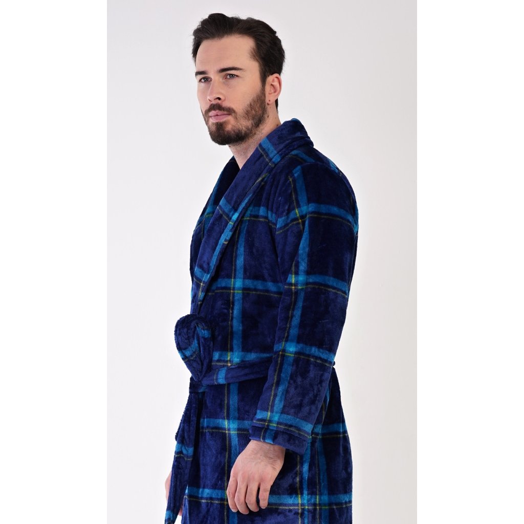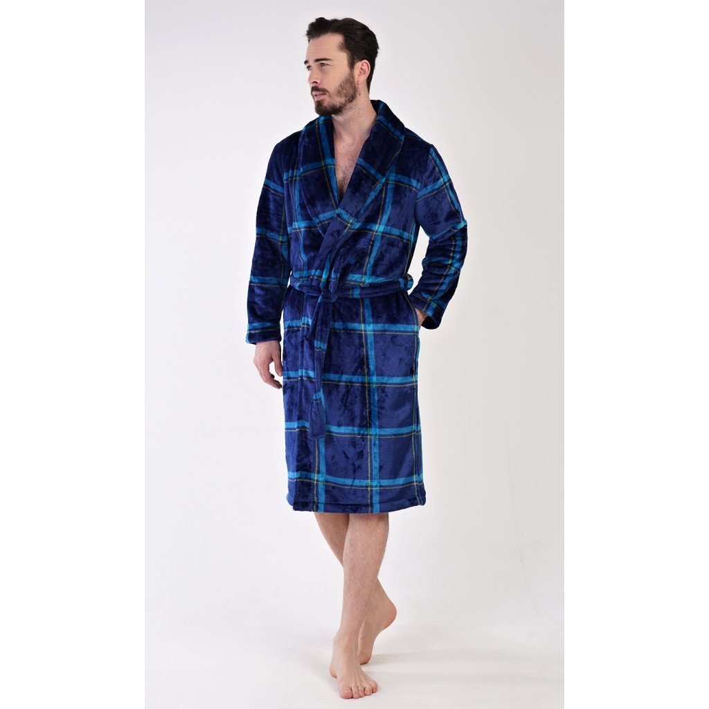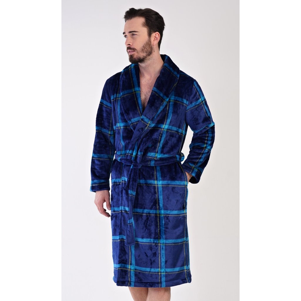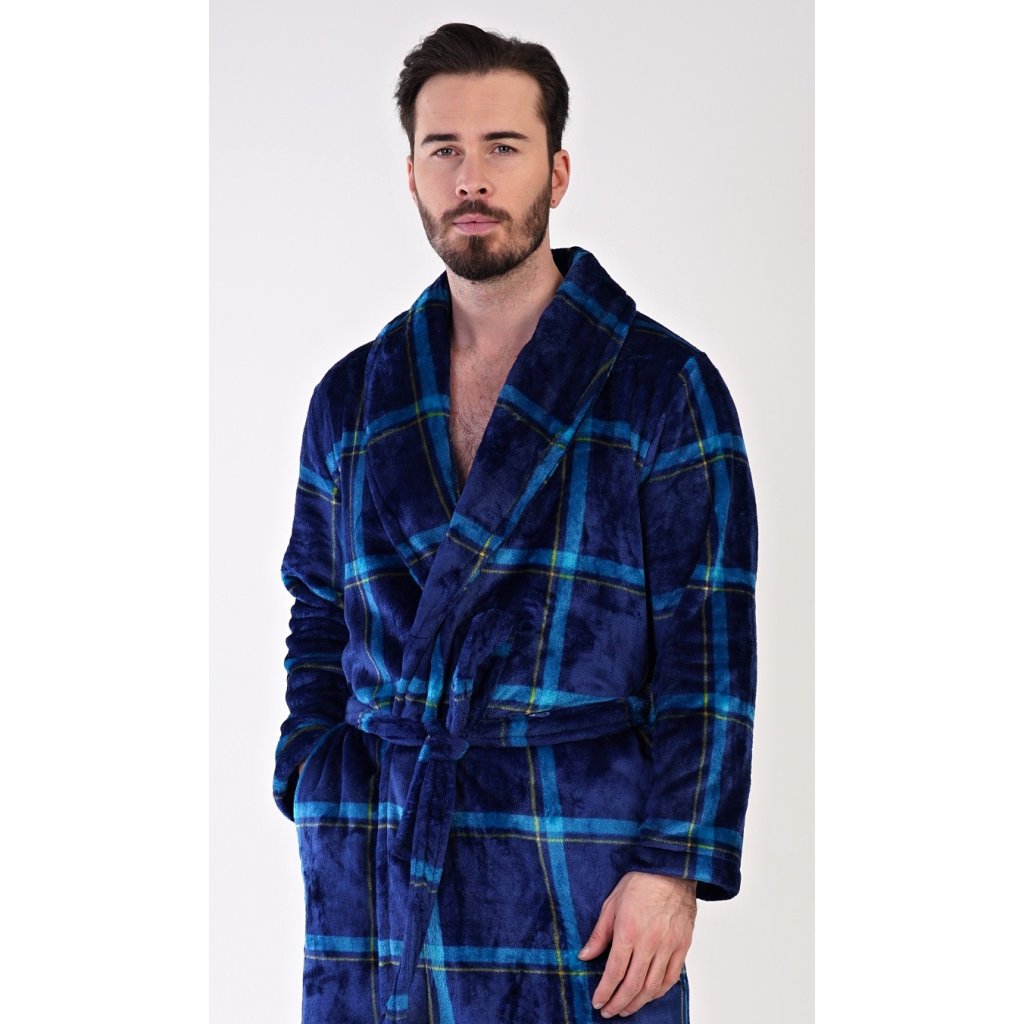 Pánský softový župan se šálovým límcem Richard. Župan má šálový límec, praktické kapsy a pásek ke stažení. Je zdobený motivem kostky v odstínech modré barvy. Použitý softový materiál je jemný a poddajný na dotek. Župan Vás zahřeje cestou z koupelny i při lenošení na gauči, bude to Váš milý společník v chladných dnech.