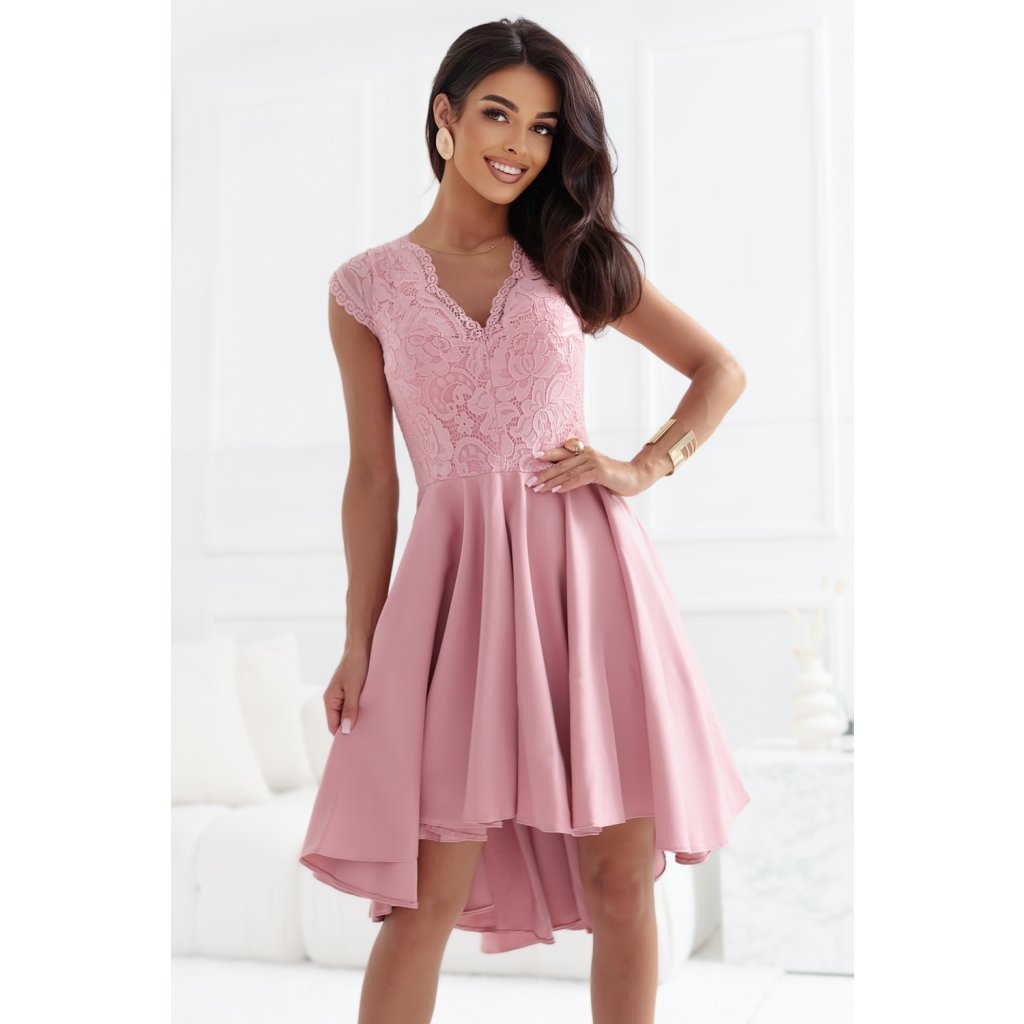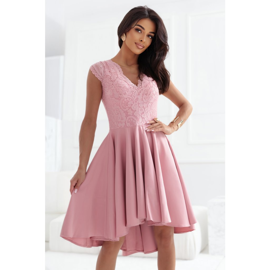 Elegantní růžové šaty s krajkovým topem a rozšířenou asymetrickou sukní. Ideální na svatbu, večírek nebo romantické rande. Vyrobeno v Polsku společností Numoco.