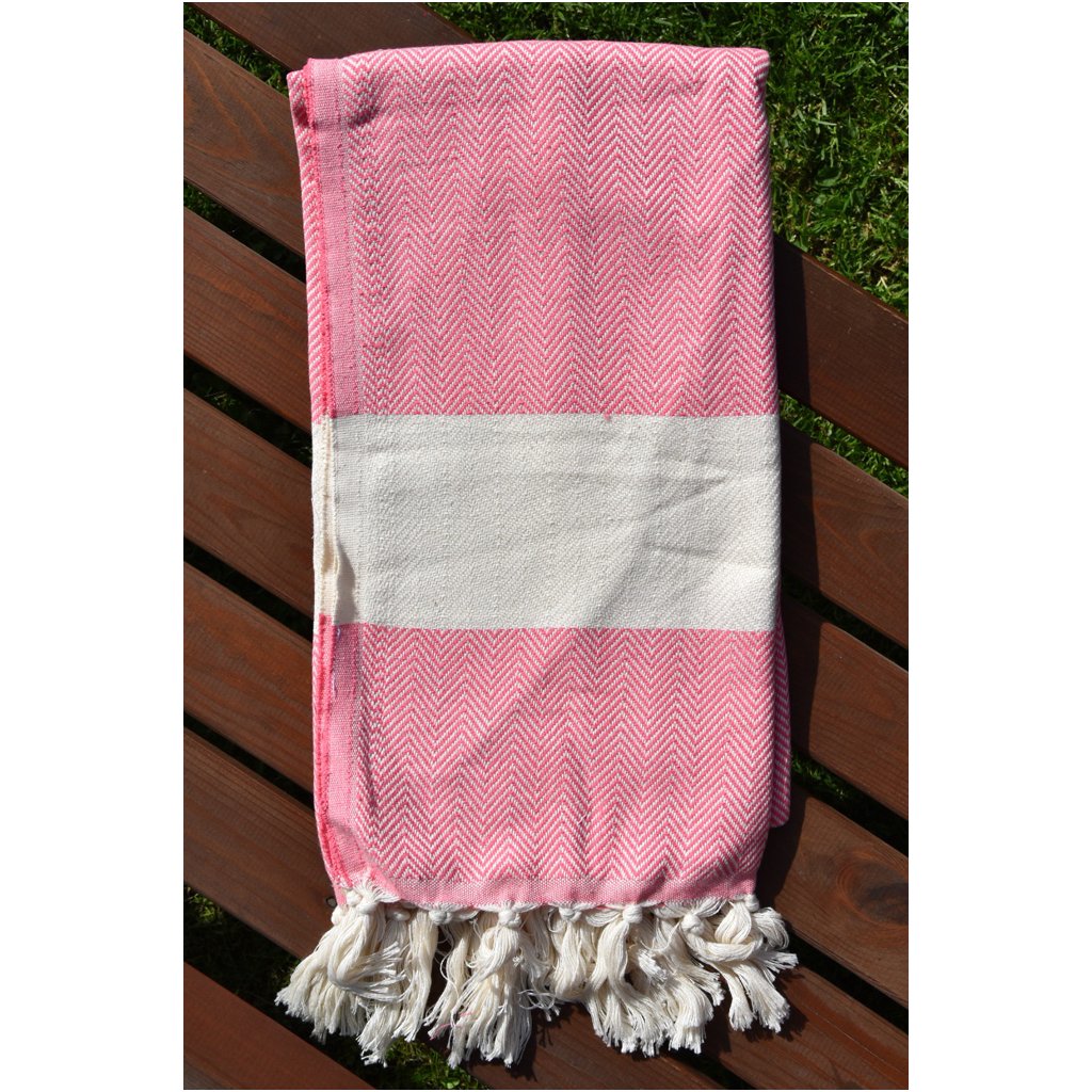 Osuška je s pruhovaným vzorem růžové a bílé barvy a na jejím konci jsou ručně vázané třásně