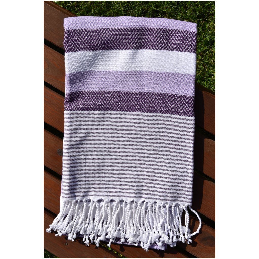 Osuška je s pruhovaným vzorem fialové, bílé a fialkové barvy a na jejím konci jsou ručně vázané třásně