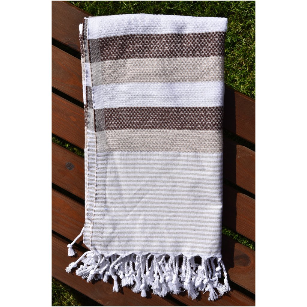 Osuška je s pruhovaným vzorem Hnědé, béžové a bílé barvy a na jejím konci jsou ručně vázané třásně