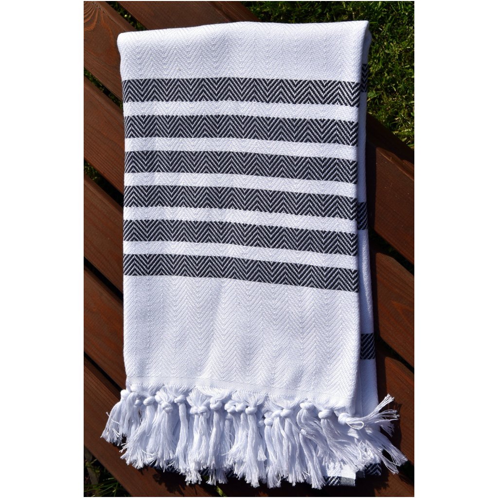 Bílou osušku lemují černé pásy a na jejím konci jsou ručně vázané třásně