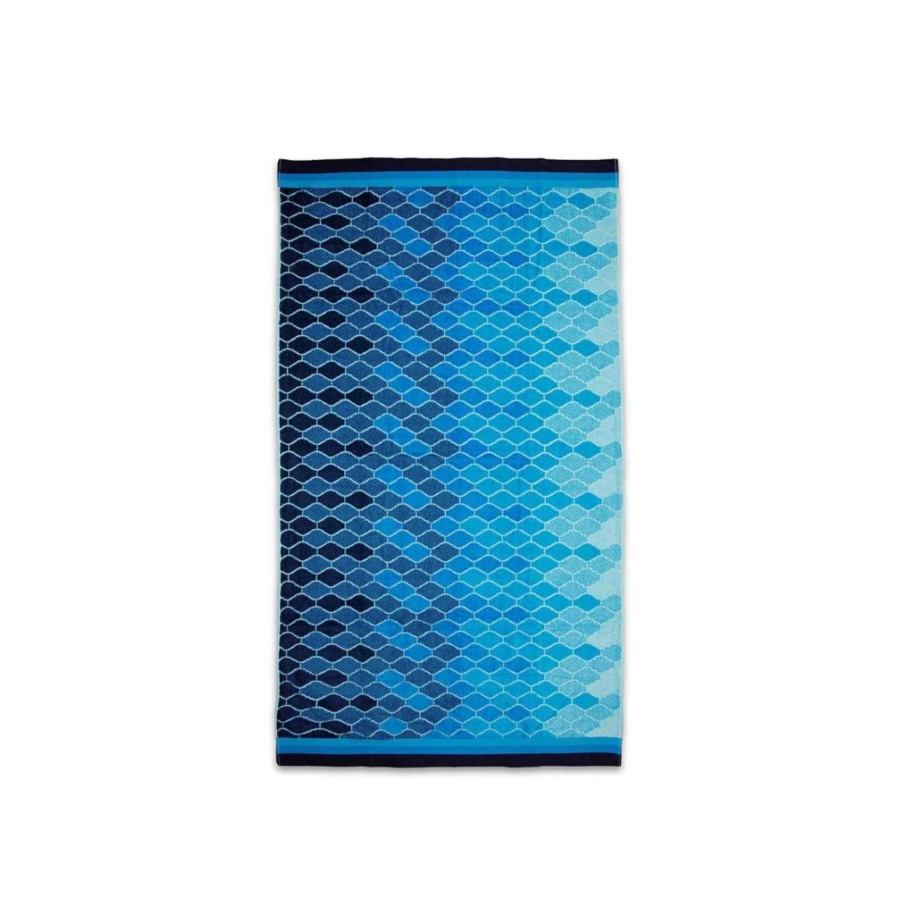 Elegantní plážová osuška Oceán přináší svěží nádech mořských vln do každého letního dne. Její design tvoří překrývající se diamantové tvary v různých odstínech modré – od temně námořnické až po světlou tyrkysovou. Tento moderní motiv zaujme na první pohled a skvěle doplní váš letní outfit.