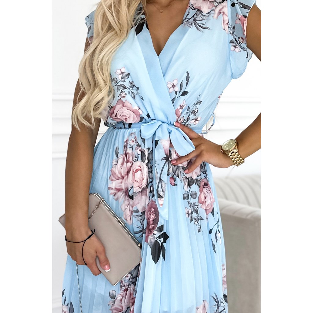 Plisované šaty s výstřihem a řasením na ramenou - světle modré se světlými růžemi 464-1