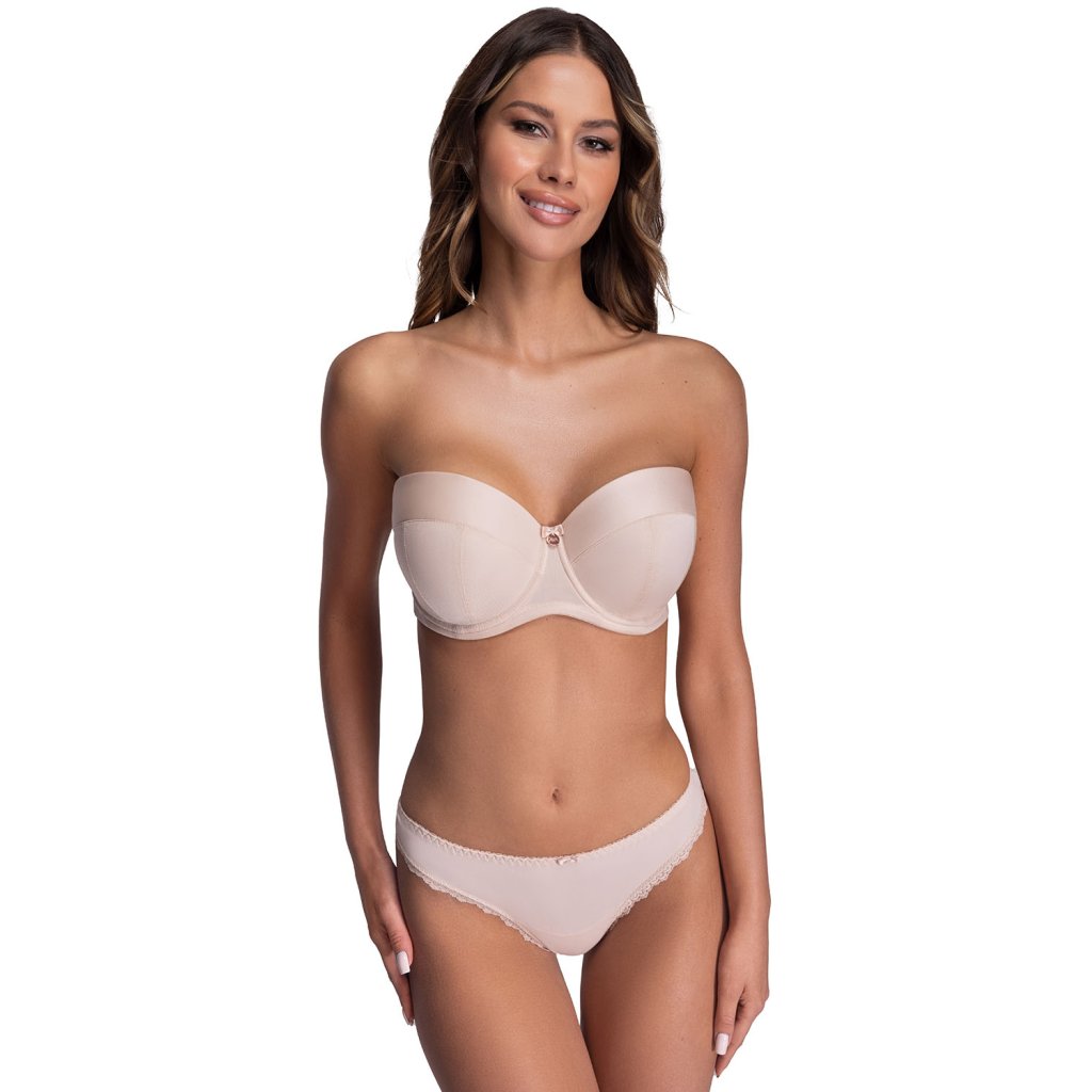 Podprsenka má vyztužené košíčky. Košíčky a můstek jsou vyrobené z hladké látky. Zadní díly modelu jsou ušité z pružné síťoviny. Mezi košíčky je umístěná mašlička s elegantním přívěskem. Model má svislé kostice. Uvnitř podprsenky se táhne silikonová páska. Ramínka je možné nastavit i odepnout. Šířka ramínek je přizpůsobená velikosti a rozměru podprsenky. Model je možné nosit i bez ramínek. Podprsenka ve velikostech push-up se zapíná dvouřadovými háčky s trojí možností nastavení délky obvodu. Ve velikosti maxi se model zapíná pětiřadovými háčky s trojí možností nastavení obvodu. Menší velikosti podprsenky mají vyjímatelné zvětšující push-up vycpávky (65 BCDE, 70 ABCD, 75 ABC, 80 AB).Doplňkové parametry