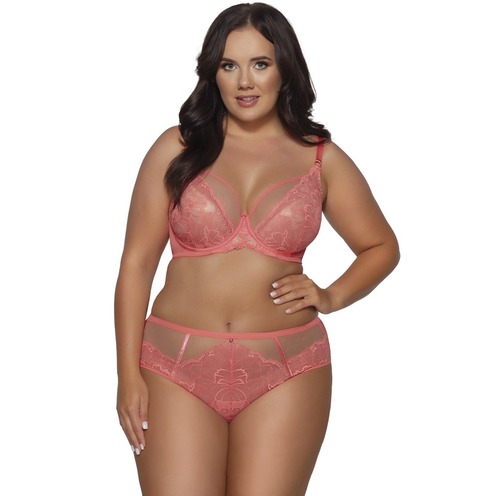 Měkká dámská podprsenka s kosticemi. Podprsenka je vyrobená ze dvojité vrstvy látky. Vrchní část košíčků tvoří béžový tyl a jemná krajka. Vrchní část košíčků je olemovaná hladkou pružnou páskou. Nad košíčky je ozdoba v podobě jemných pásků. Ramínka je možné nastavit, ale nelze je odepnout. Podprsenka má střih a konstrukci typu 1154. Složení: 88 % polyamid, 8 % bavlna, 4 % elastan.Doplňkové parametry