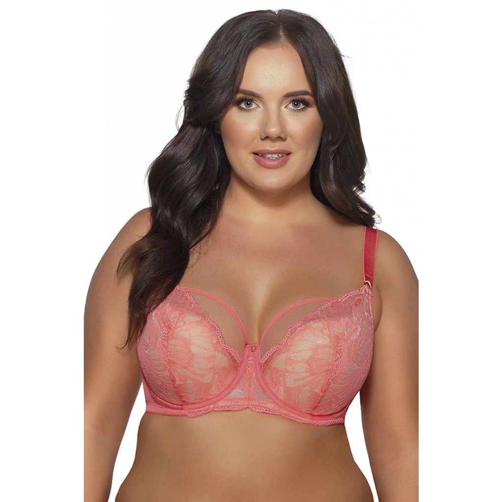 Poloměkká podprsenka- košíčky z květinové krajky v korálové barvě s kosticemi