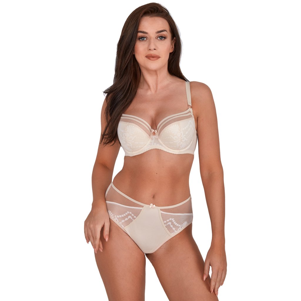 Elegantní polovyztužená podprsenka ve světle hnědé barvě.- horní část košíčků je pokrytá síťovinou a ozdobnými proužky.