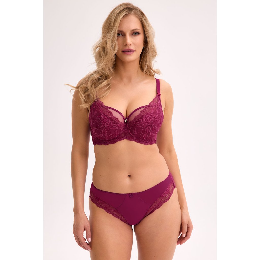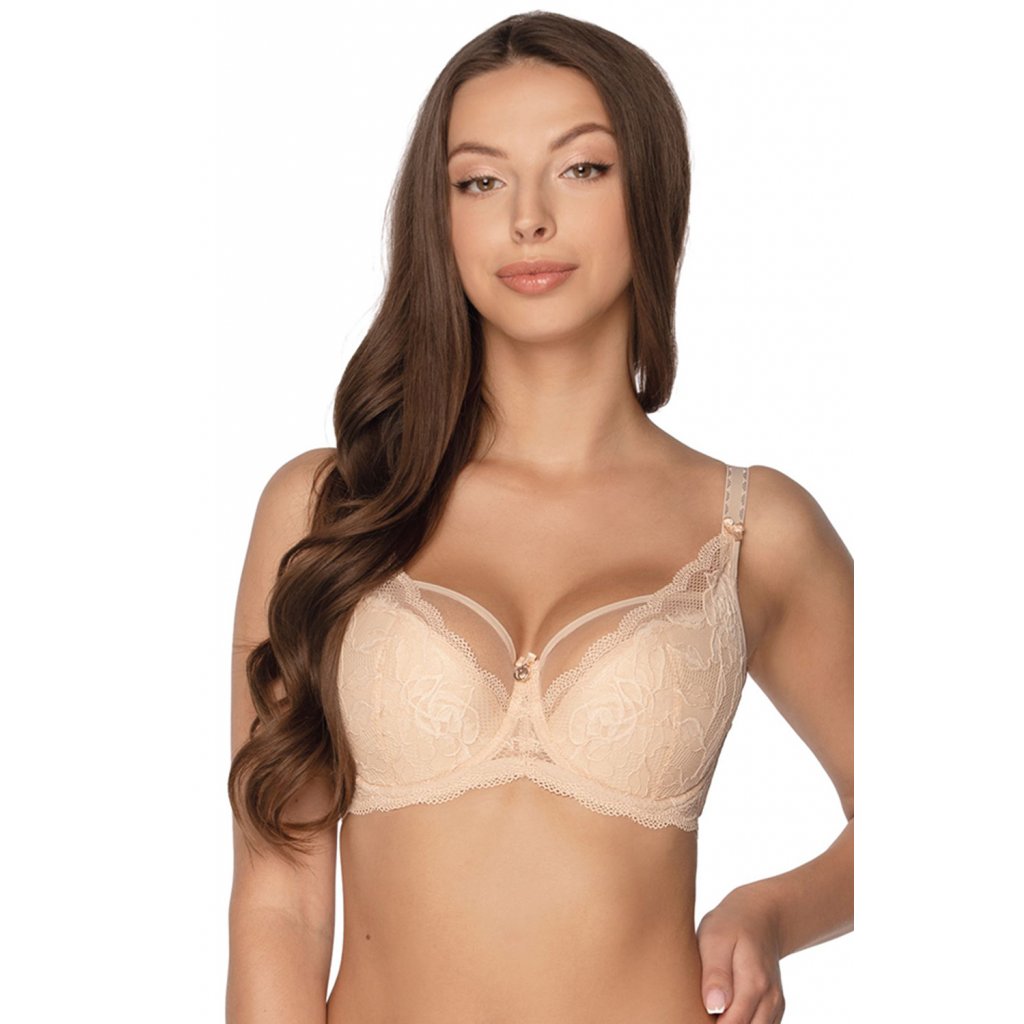 Polovyztužená dámská podprsenka s kosticemi, která je vyrobená z krajky a síťoviny. Ramínka není možné odepnout. Boky modelu jsou ušité z pružné hladké látky. Model dokonale nadnáší poprsí. Podprsenka má střih a konstrukci typu SS10. Složení: 49% polyamid, 28% polyester, 14% bavlna, 9% elastan.Doplňkové parametry