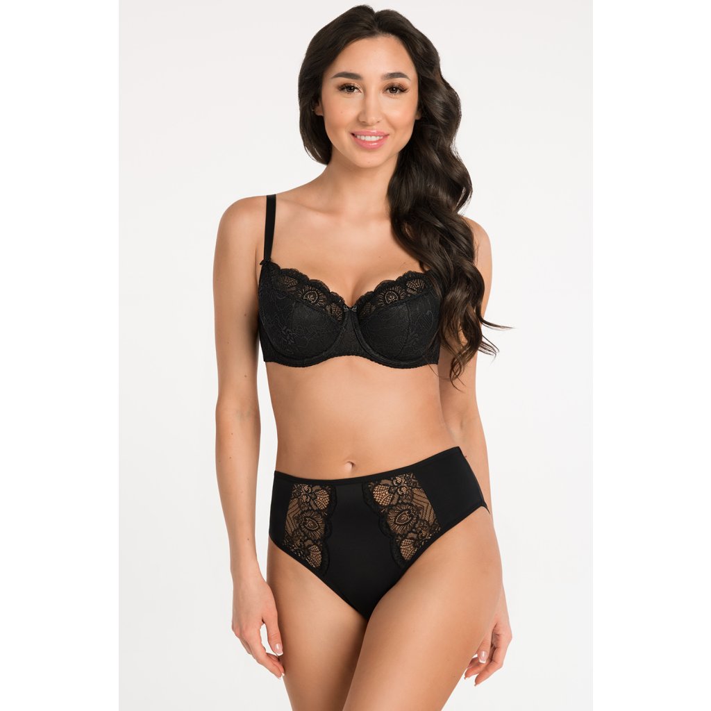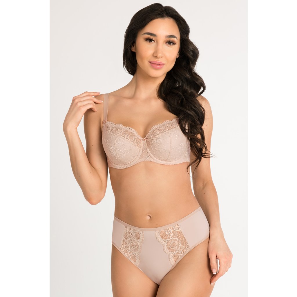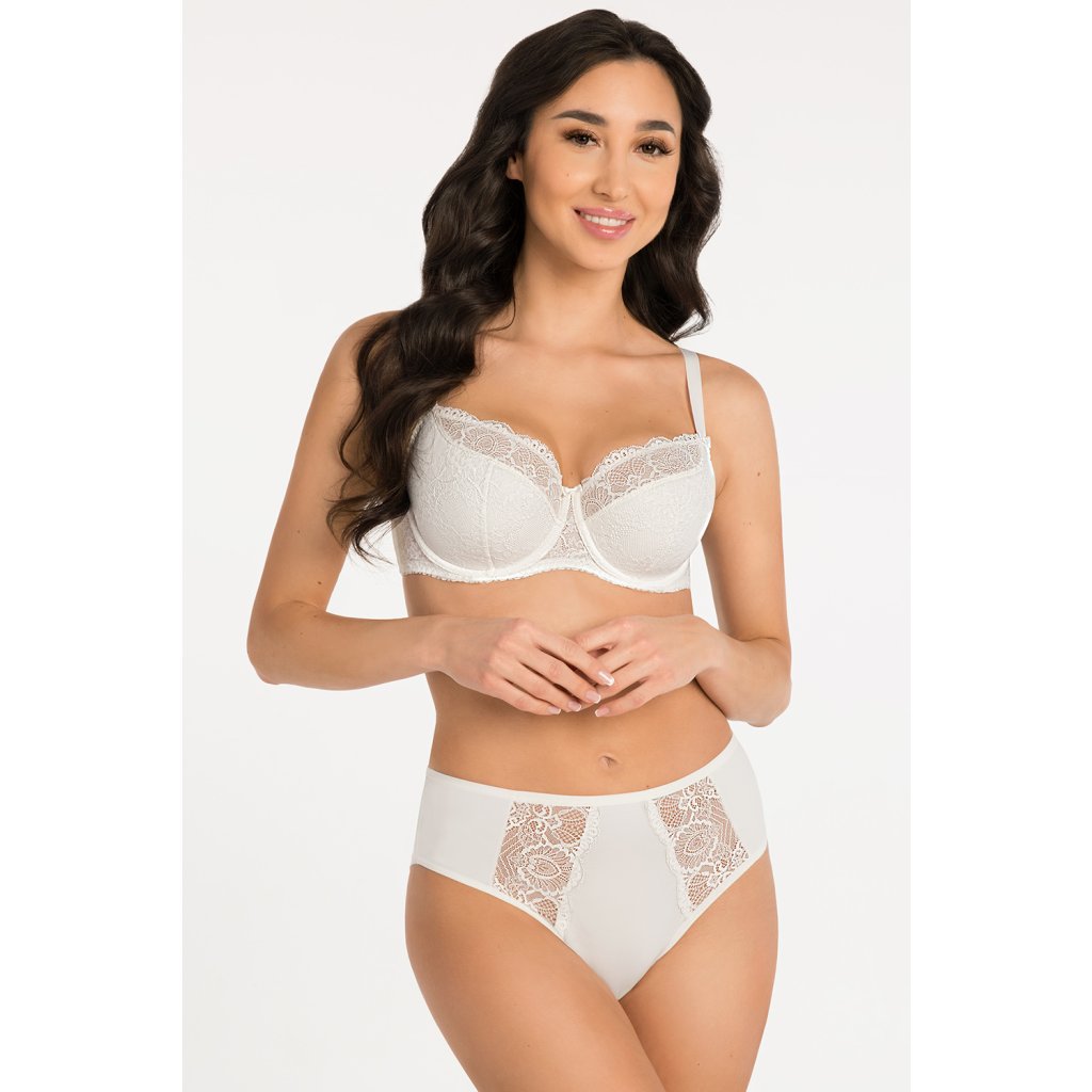 Elegantní polovyztužená krajková podprsenka.Spodní část košíčků modelu je vyztužená měkkou pěnou, která je z vnitřní strany podšitá bavlnou. Díky tomu je podprsenka při nošení velmi pohodlná. Horní část košíčků je vyrobená z krajky podšité jemnou nepružnou síťovinou, díky které podprsenka krásně přiléhá k poprsí. Tento model nádherně stahuje poprsí ke středu hrudníku, nádnáší poprsí a vytváří pěkné oblé tvary.Můstek je vyrobený z krajky a střed podprsenky zdobí málá půvabná mašlička.Ramínka je možné nastavit, ale nelze je odepnout. Šířka ramínek závisí na rozměru podprsenky. Na bocích modelu jsou svislé kostice. Podprsenka se zapíná na dvou nebo třířadové háčky (v závislosti na rozměru) s trojí možností nastavení obvodu.Složení: 71 % polyamid, 8 % elastan, 21 % bavlna.Doplňkové parametry