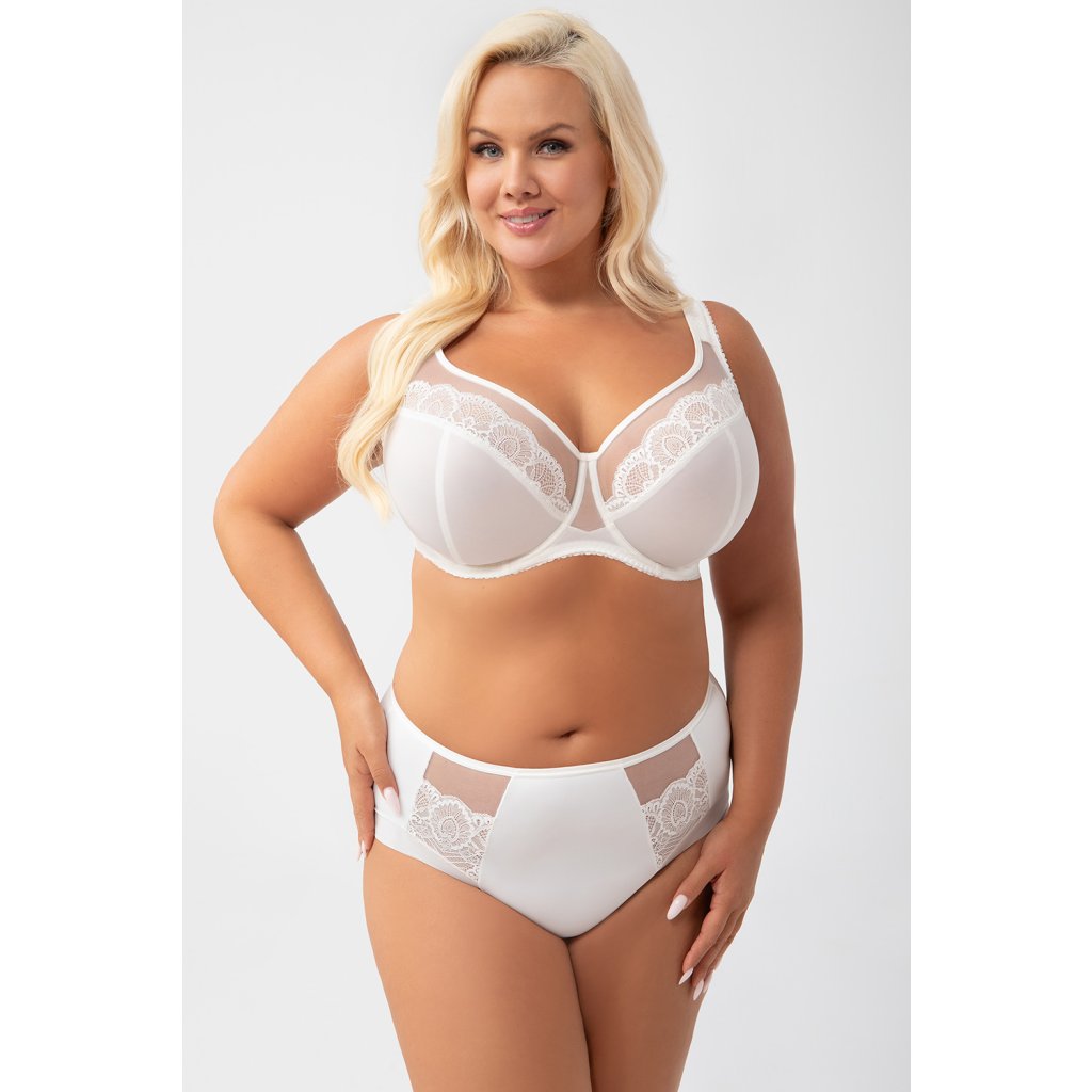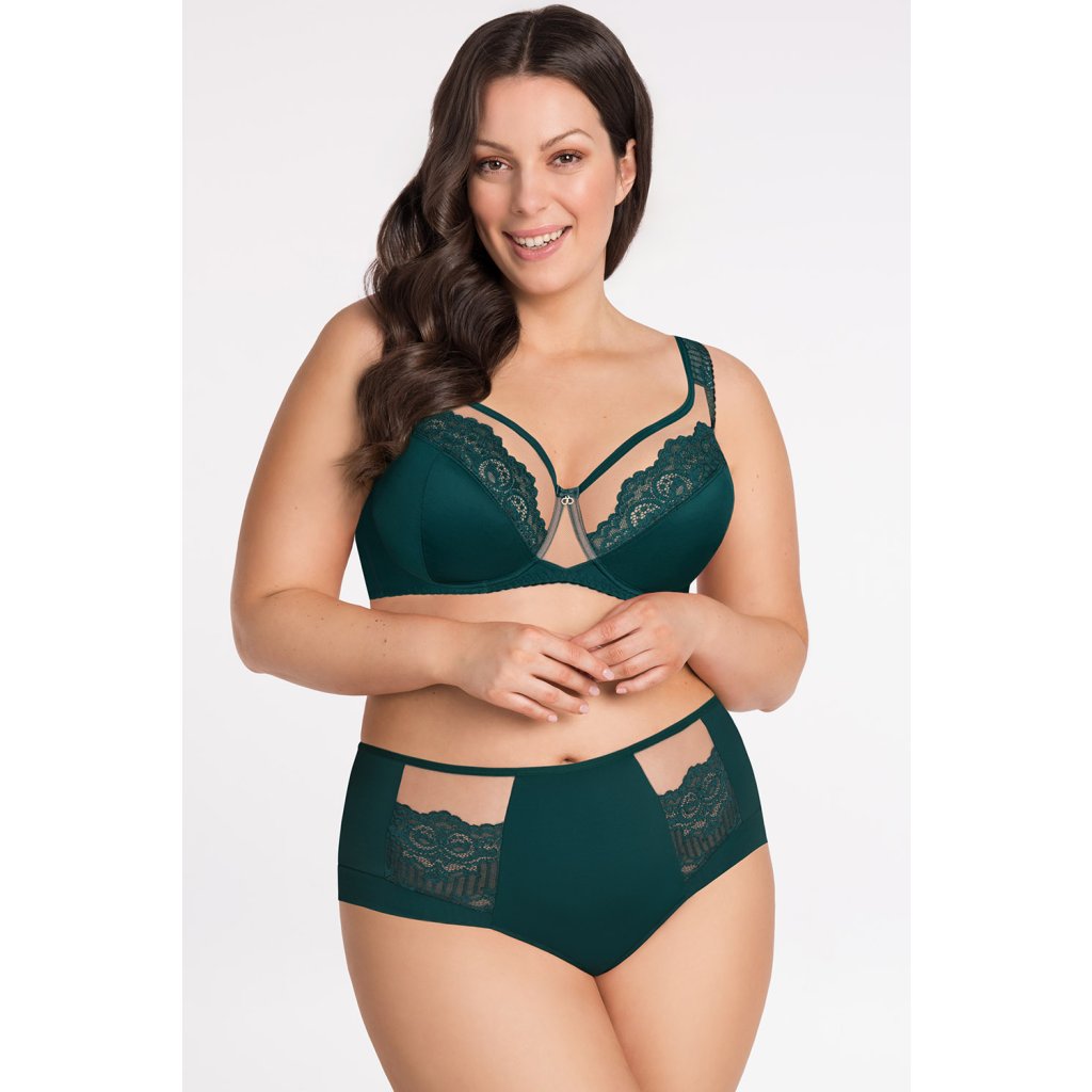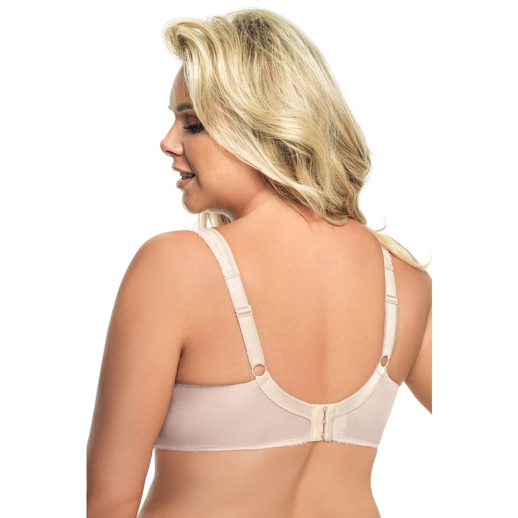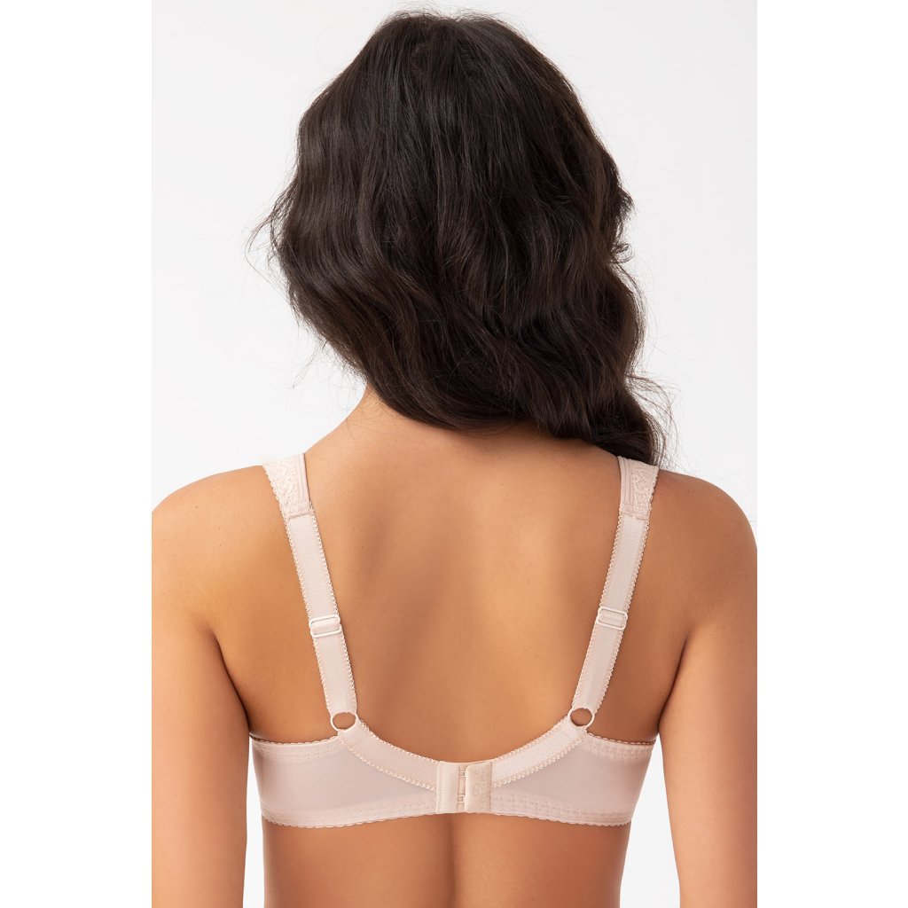 Měkká, nevyztužená podprsenka. Košíčky dobře obepínají poprsí a drží ho na místě, krásně zvýrazňují dekolt. Spodní části košíčků jsou vyrobeny ze stabilního, matného úpletu. Horní část je vyrobena z průsvitného tylu, překrytého krásnou krajkou. Můstek je vyroben z hladšího úpletu a tylu. Košíčky jsou tvarovány drátkem, který obepíná prsa. To zajišťuje, že prsa jsou dokonale vycentrovaná, zvednutá a udržují si krásný, zaoblený tvar.Široké boky z pevného lycra úpletu, navíc vybavené svislými kosticemi, zajišťují, že podprsenka drží na místě.