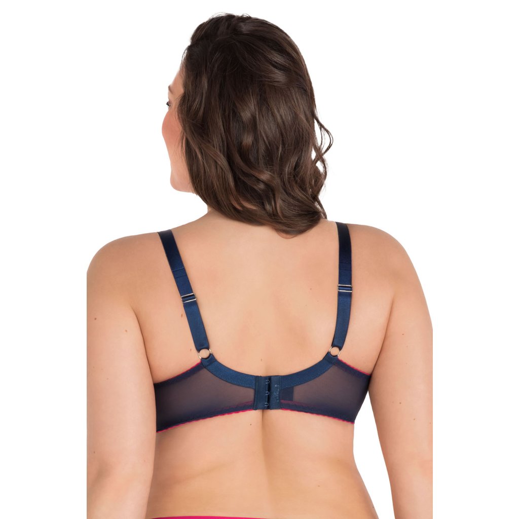 Měkká podprsenka pro dámy se středním i velkým poprsím. Vyšší střed zajišťuje dobrou stabilitu. Ramínka jsou více po stranách. Takže prsa jsou krásně nahrnuta do středu dekoltu. Perfektní tvar a pevnost, která na první pohled zaujme. Ramínka mají různou šířku podle konkrétní velikosti. Košíčky jsou podšity tylem, na nich vyniká atraktivní vzor. Linii dekoltu zdobí elastické obšití v kontrastní barvě. Obvod je pevný, dobře drží. Po stranách jsou svislé výztuhy, které lépe podprsenku fixují na těle. Mezi košíčky i na ramíncích vynikají ozdobné mašličky. Podprsenka perfektně modeluje a poskytuje dobrou oporu.Doplňkové parametry