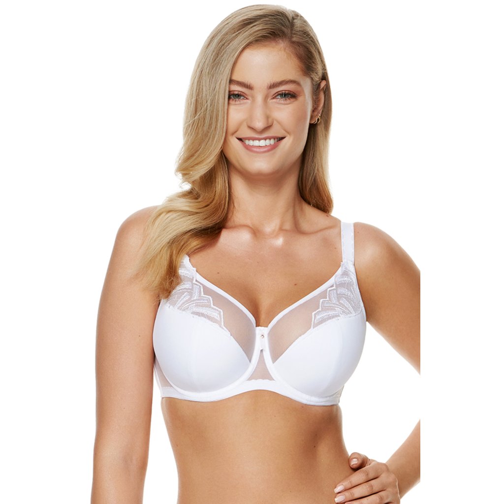 Dámská polovyztužená podprsenka v bílé barvě.- spodní část košíčků je vyrobena z tenké korzetové pěny a horní část je vyrobena z lesklé výšivky, díky které se podprsenka dokonale přizpůsobí tvaru prsou