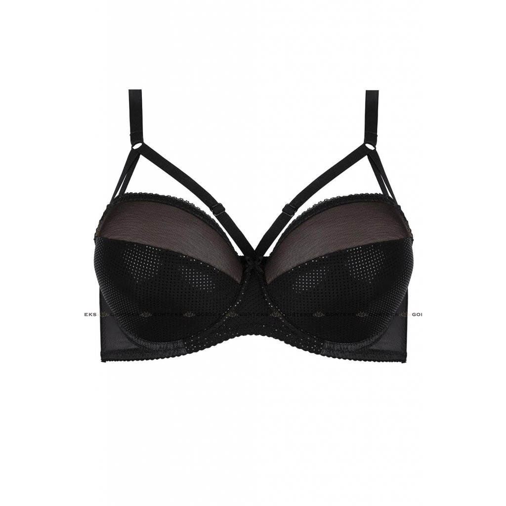 Horní část košíčků je pokrytá černým elastickým tylem a olemována elegantní krajkou. Dolní díl košíčků je obšitý černou látkou s jemnými, měnícími se puntíky. Tento model získává na kráse i díky ozdobným páskům ve výstřihu a díky jemné mašličce, která je umístěna mezi košíčky.