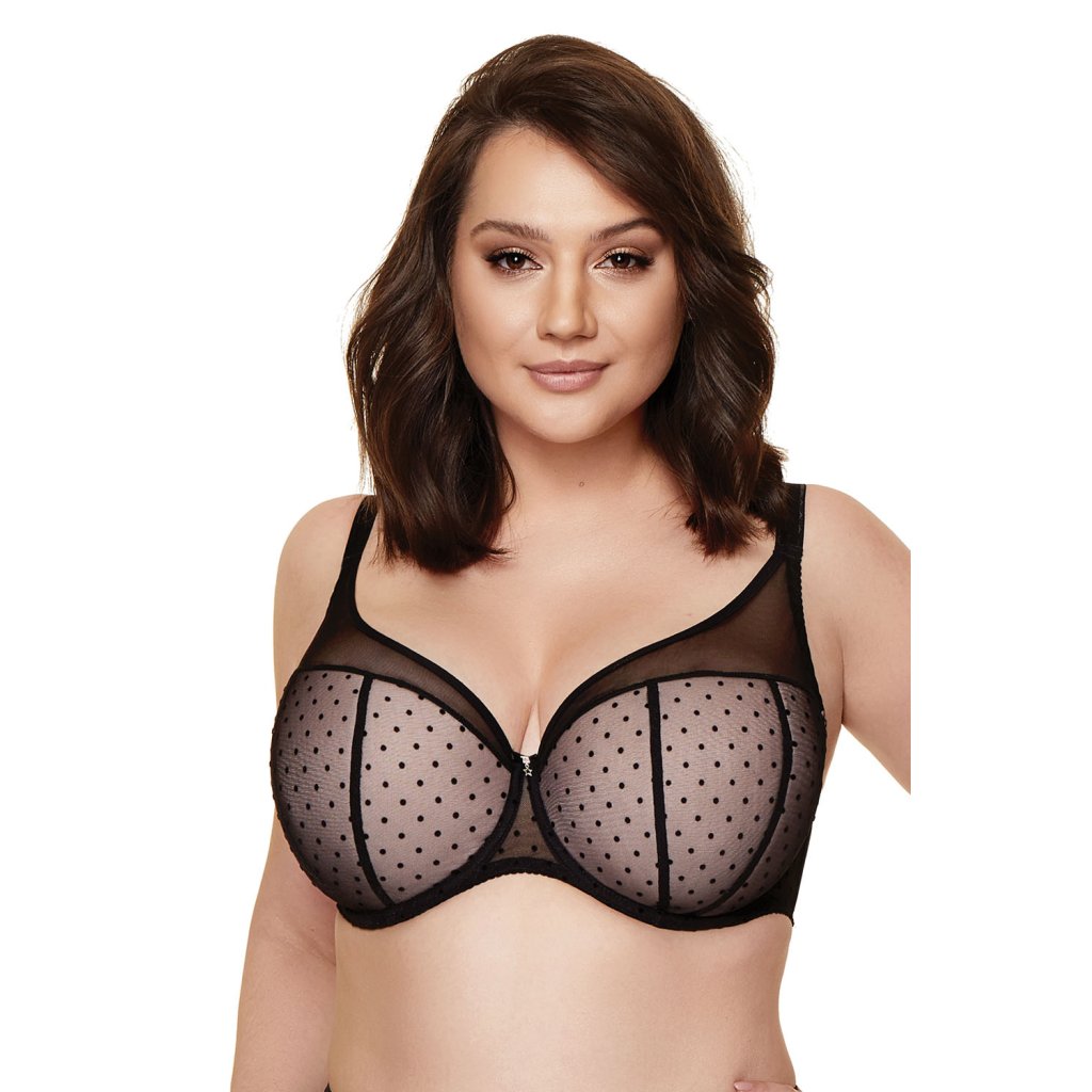 Pěkná dámská vyztužená podprsenka, která dokonale tvaruje poprsí.Košíčky modelu jsou obšité tylem se svůdnými puntíky. Ozdoba ve tvaru hvězdičky, která je umístěná mezi košíčky, dodává celému modelu na půvabu.Košíčky mají tři části a jsou ušité z tenké pěny, která se používá při výrobě korzetů. Vrchní linie košíčků je prodloužená tylem. Vnitřní část košíčků je pokrytá bavlnou. Boky modelu jsou ušité ze dvojité síťoviny. Díky svislým bočním kosticím se boky modelu při nošení nedeformují. Zadní díly podprsenky tvoří zpevněný tyl. Ramínka je možné nastavit, ale nelze je odepnout. Podprsenka se zapíná dvou, nebo třířadovými háčky s trojí možností nastavení délky obvodu. Model má střih a konstrukci typu B-406.Složení: 65 % polyamid, 20 % polyester, 10 % bavlna, 5 % elastan.Doplňkové parametry