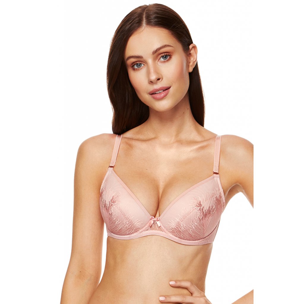 Extrémně ženská push-up podprsenka v růžové barvě.- misky potažené tylovou síťovinou potažené originální výšivkou podobnou peříčku