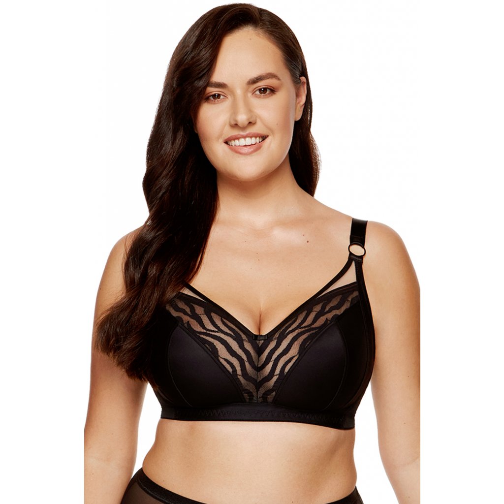 Senzační měkká podprsenka v černé barvě. - horní část košíčku a střed tvoří krajka se zvířecím vzorem - spodní díl je z hladkého úpletu - model bez kostic a drátků, který dokonale podpírá poprsí - nastavitelná, neodnímatelná ramínka, různé šířky podle velikosti - zadní část podprsenky je vyrobena z elastické Lycry - zapínání na háčky, různé šířky přizpůsobené velikosti Složení: 70% polyamid, 25% polyester, 5% elastan. Důležité! Podprsenky Gorteks mají oproti jiným značkám méně hluboké košíčky, zejména ve velikostech pro střední a velká prsa. Při výběru velikosti doporučujeme zvolit košíček o číslo větší.