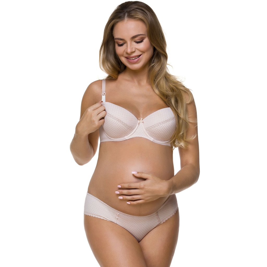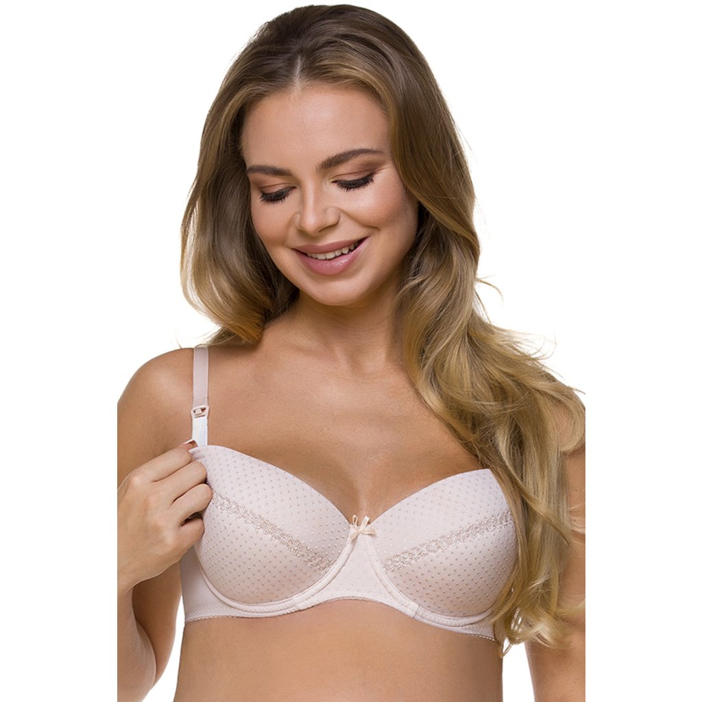 Elegantní vyztužená podprsenka z mikrovlákna s drobnými tečkami. Podprsenka je ideální pro kojení, a to díky pohodlně odnímatelným klipsům Clic-Clac, které umožňují odepnout a zapnout košíčky jednou rukou, což vám umožní nakrmit dítě, aniž byste podprsenku sundali. Košíčky na vnitřní straně podšité bavlnou s antibakteriální úpravou, která zvyšuje komfort používání. Zadní strana je vyrobena z hladké pleteniny. Model má třístupňovou, dvouřadou úpravu zapínání a nastavitelná, neodepínatelná ramínka. Podprsenka bez postranních kostic.Složení: 70% polyamid, 20% elastan, 10% bavlna.