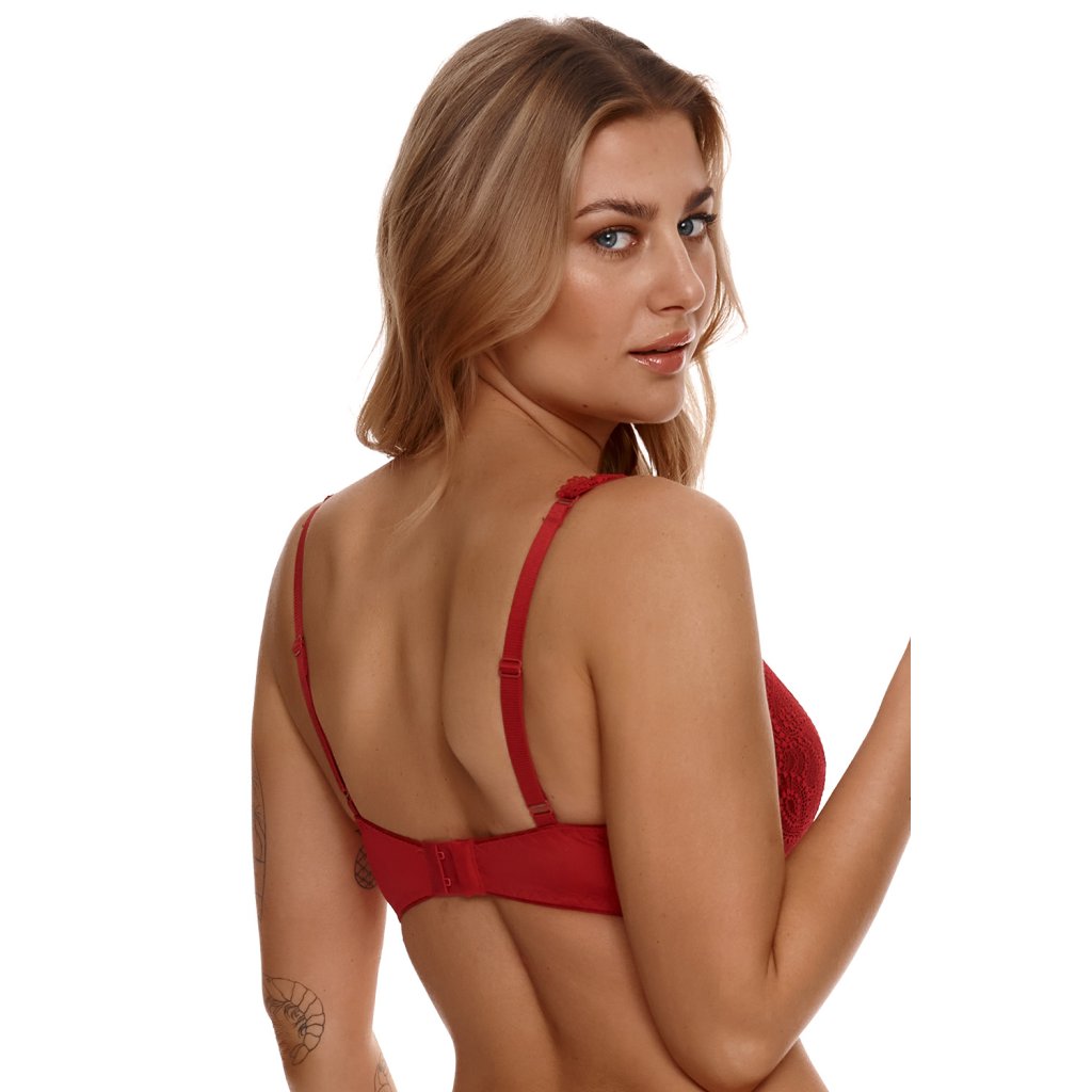 Sexy a romantická push-up podprsenka, která zaujme svou jemností a vzdušností. Model je v sexy červené s prvky nadčasové černé. Konstrukce, která dokonale sbírá a tvaruje střední a větší poprsí. Mezi košíčky je půvabná mašlička, která kontrastuje s celkem. Nastavitelná, neodepínatelná ramínka. Zapínání vzadu na háčky.Na doplnění sady doporučujeme kalhotky 2311-13.