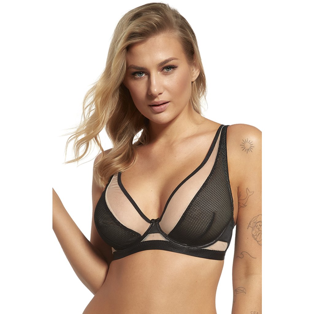 Měkká podprsenka s kosticemi:- košíčky z černé siťoviny, podšité béžovým tylem