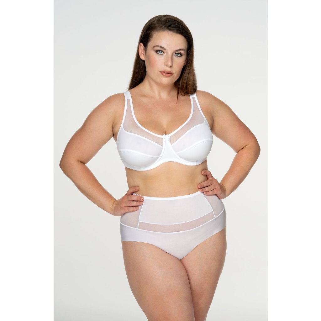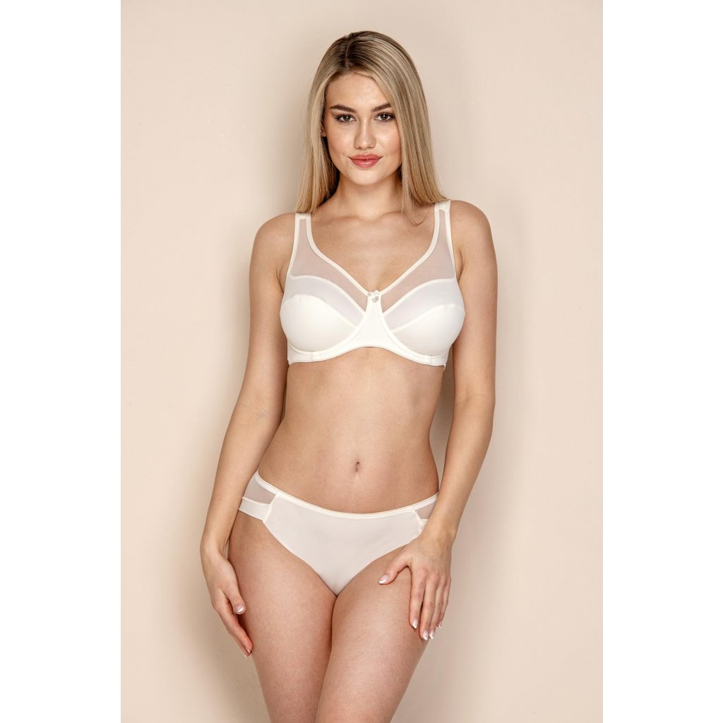 Jeden z nejoblíbenějších střihů v prodeji již přes 12 let! Podprsenka má vyšší střed optimální pro velká prsa, ramínka jsou obšitá, aby se zabránilo zařezávání do ramen. Košíček se skládá ze tří dílů, aby se perfektně přizpůsobil, přičemž díl, který kopíruje dekolt je z elastického tylu, čímž je podprsenka jednoduchá a přesto neobyčejná. Střed zdobí mašlička.