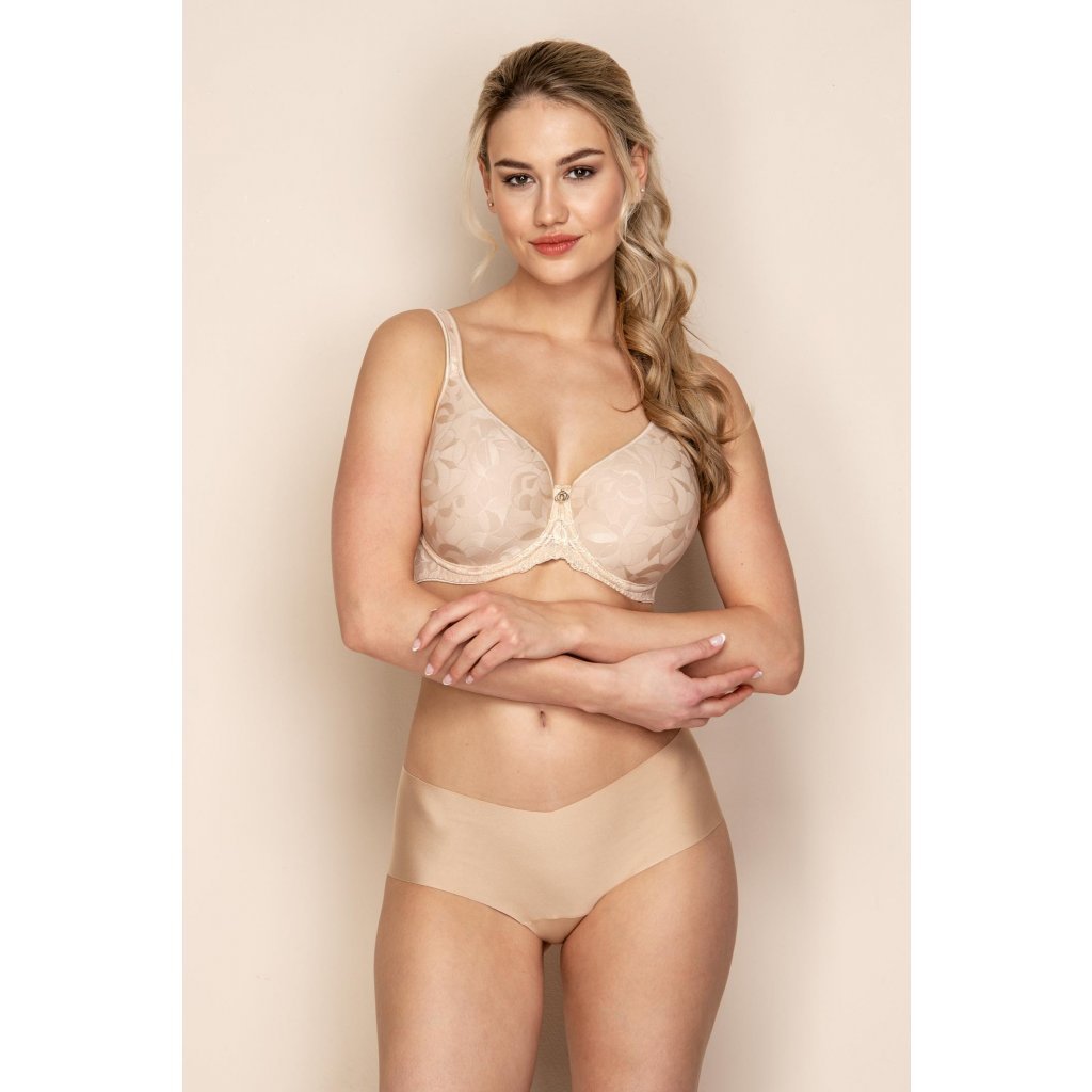 Velice luxusní a propracovaná podprsenka určená pro ženy s větším poprsím je vyrobena z materiálu s velmi jemným vzorečkem. Podprsenka má vyztužený bezešvý koš a kostice. Díky vyššímu sedlu a pevnému zadnímu dílu vyztuženým boční kosticí zaručuje komfort a pohodlí ženám s větším poprsím. Zadní díl je z velmi pevného materiálu se zapínáním na dvojháček. Podprsenka má širší podložená ramínka s měkkou výztuží proti zařezávání se do ramenou.