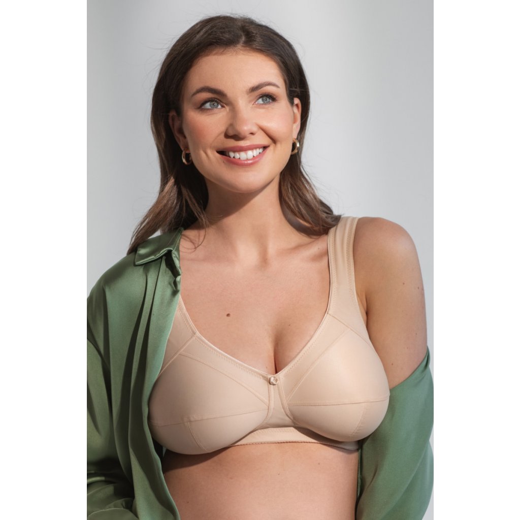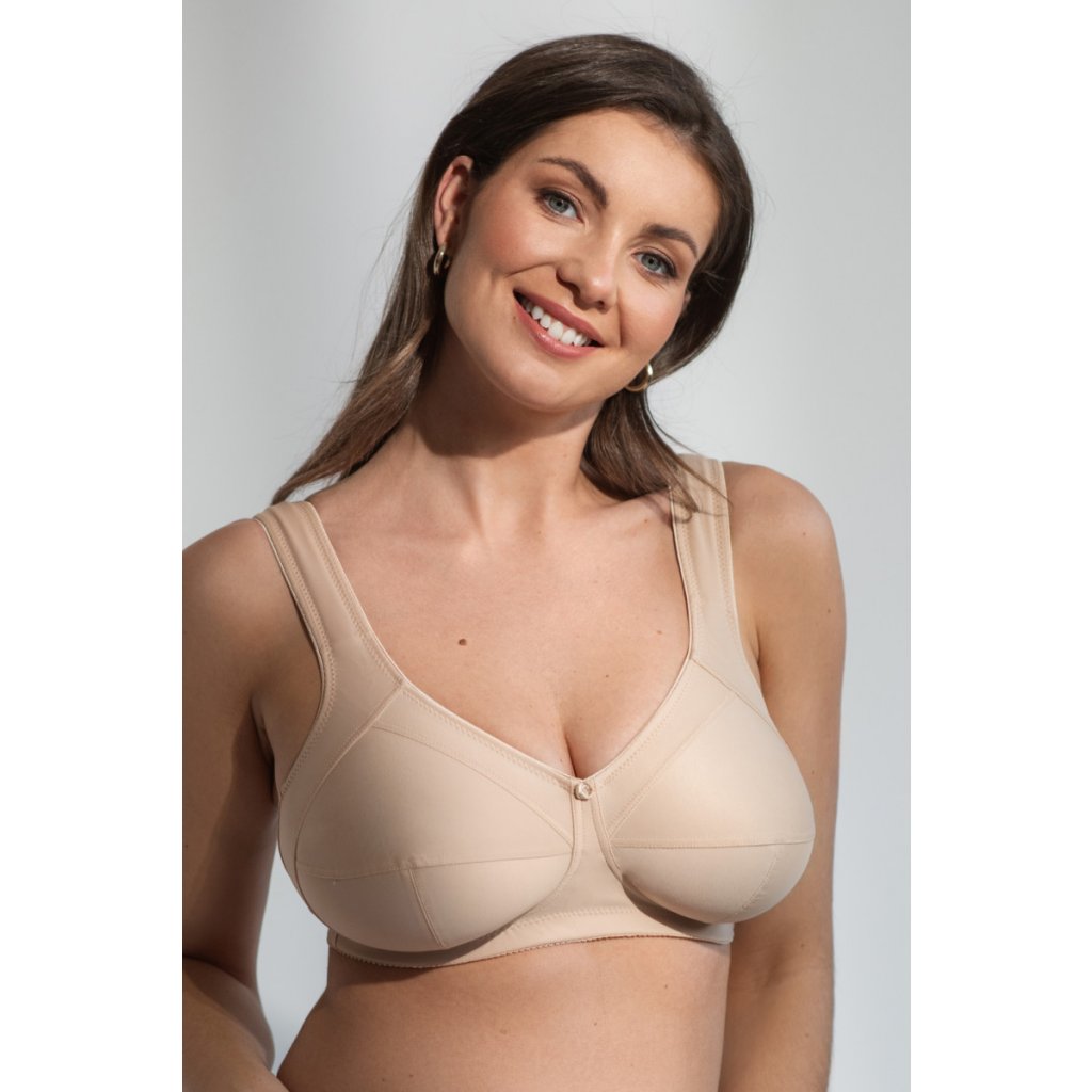 Kvalitní podprsenka bez kostic značky TRIOLA je vyrobena z hladkého, vysoce komfortního materiálu. Výhodou modelu jsou rozšířená podložená ramínka, která uleví šíji a dodají pocit pohodlí. T-šev zajistí přirozeně kulatý tvar koše, boční dílky upevní prsa na středu. Vhodná pro větší velikosti, v nabídce až do velikosti košíčku I.