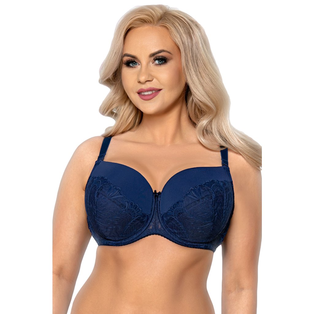 Elegantní vyztužená podprsenka v tmavě modrém provedení.- košíčky vyrobené z hladkého materiálu a výšivky