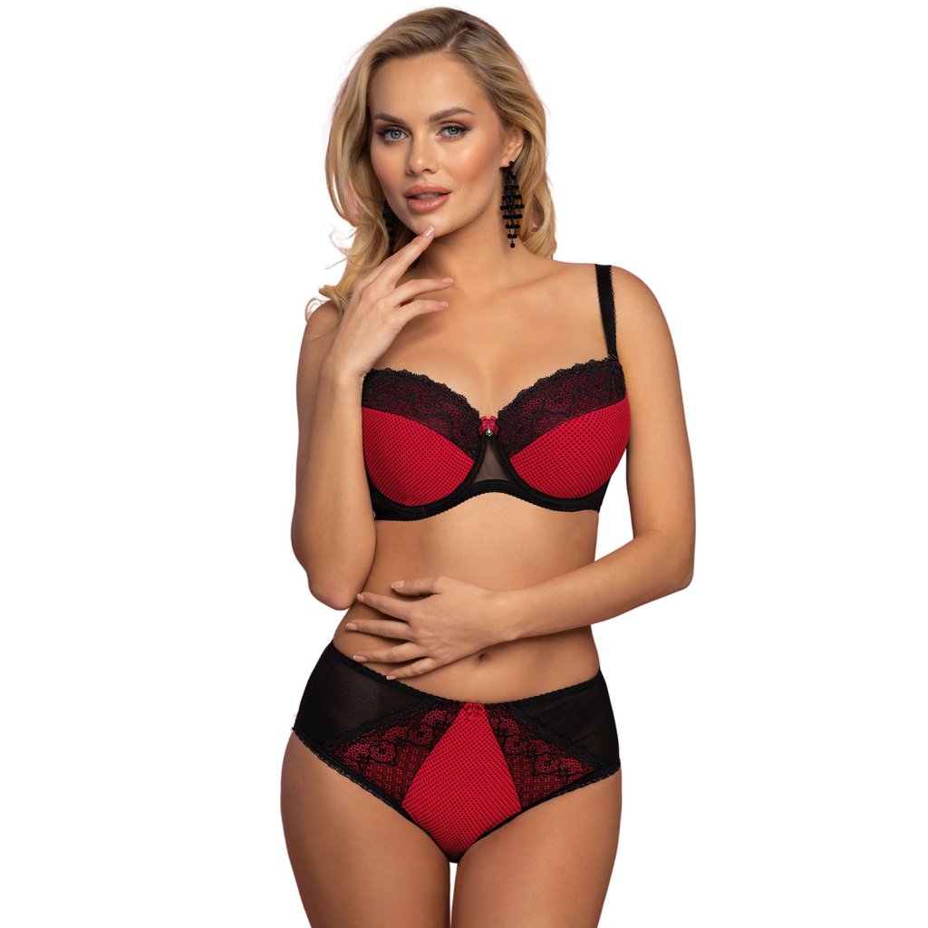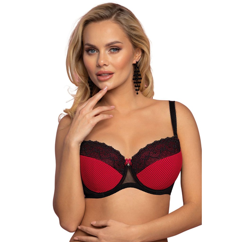 Elegantní vyztužená podprsenka z červeného úpletu s potiskem jemných černých teček a pěkně zdobenou černou krajkou.