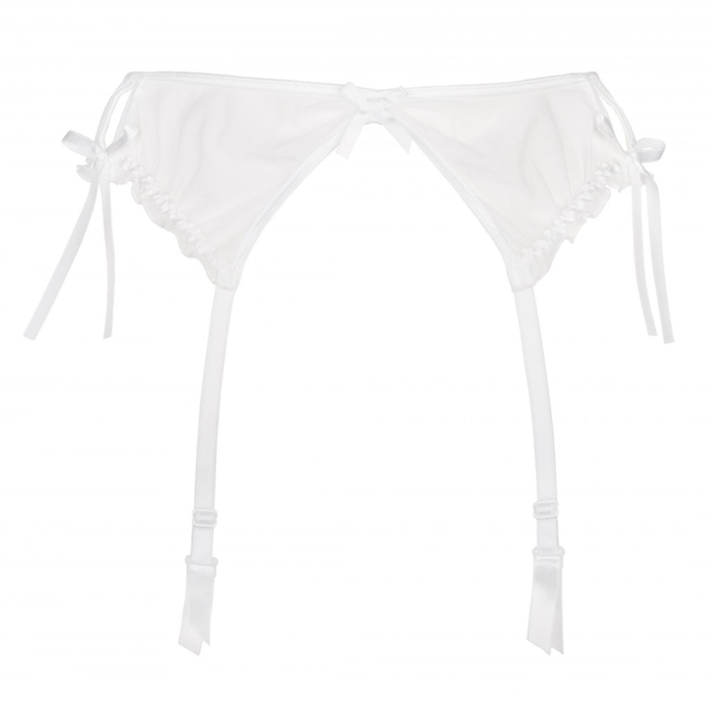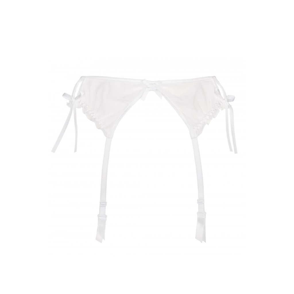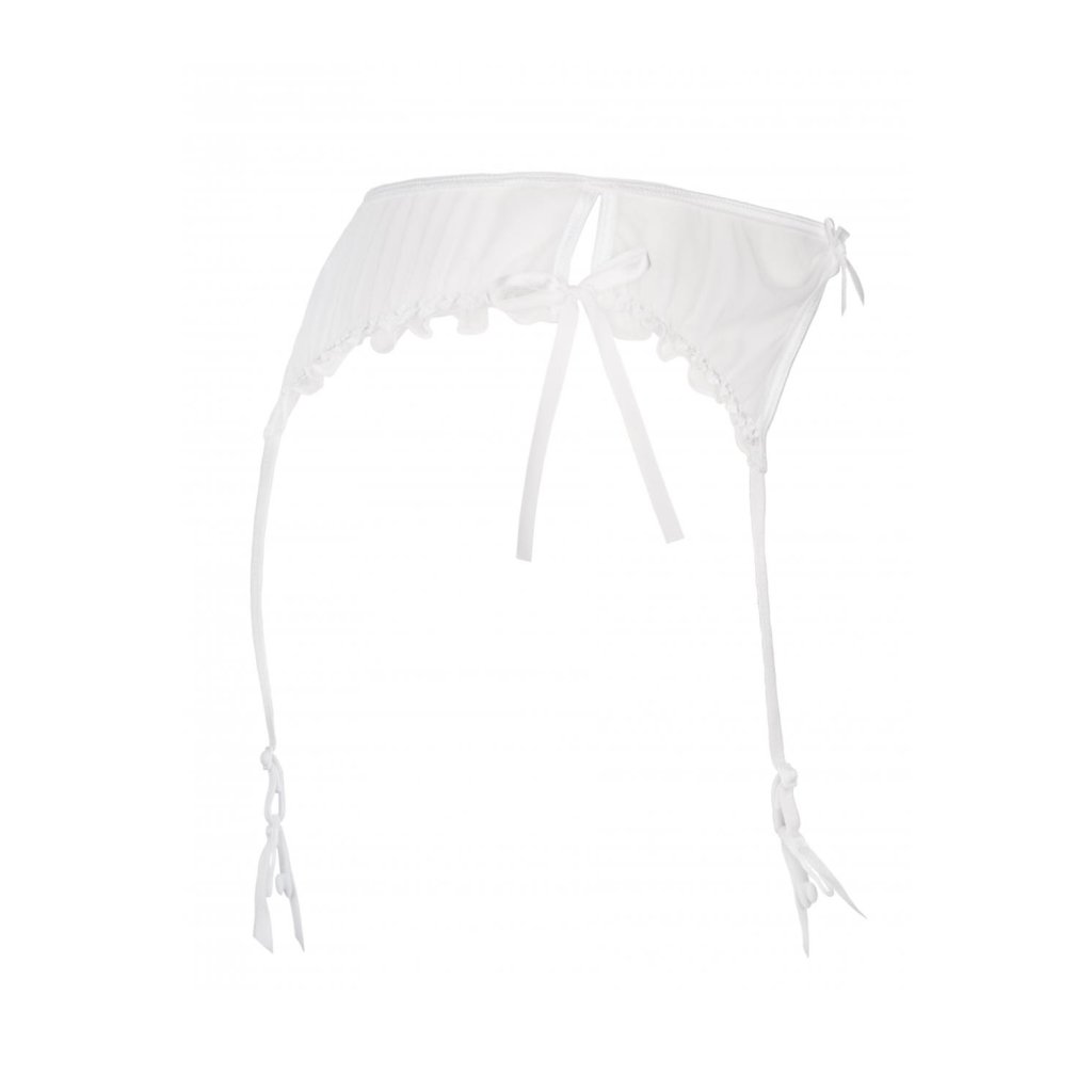 Smyslný, sněhově bílý podvazkový pás Neige zdůrazní křivky vašich boků. Podvazkový pás je vyroben z jemné tylové síťoviny. Svůdné rozparky, mašle a volánky dodávají šarm. Model má nastavitelné, neodnímatelné popruhy a třípolohové zapínání na dva háčky.K soupravě doporučujeme tanga a podprsenku Neige.