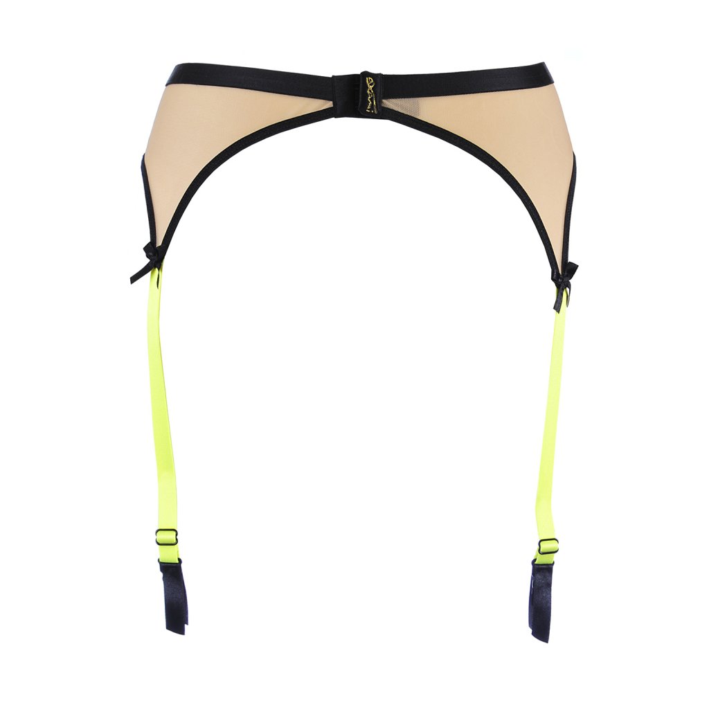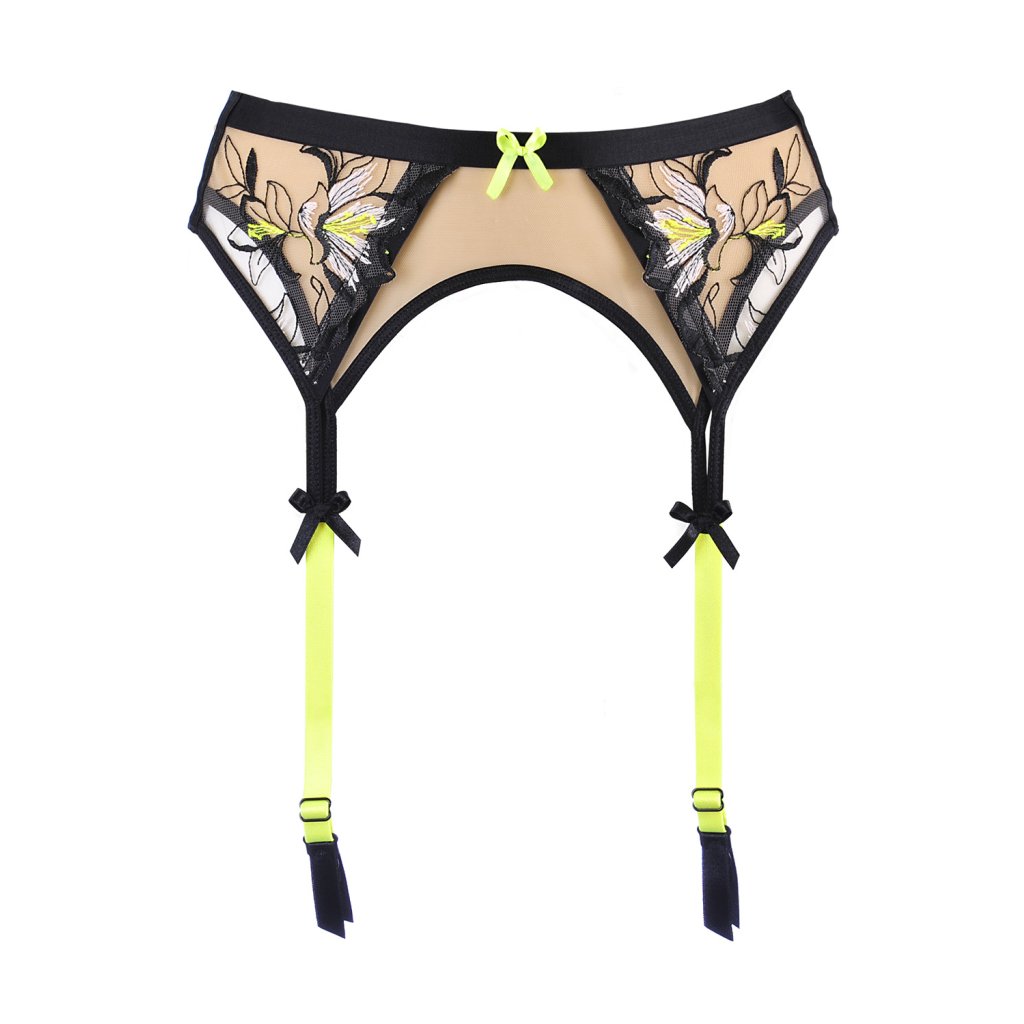 Sexy podvazkový pás s černobílou výšivkou a neonově žlutými doplňky.- vyrobeno z jemné tylové síťoviny