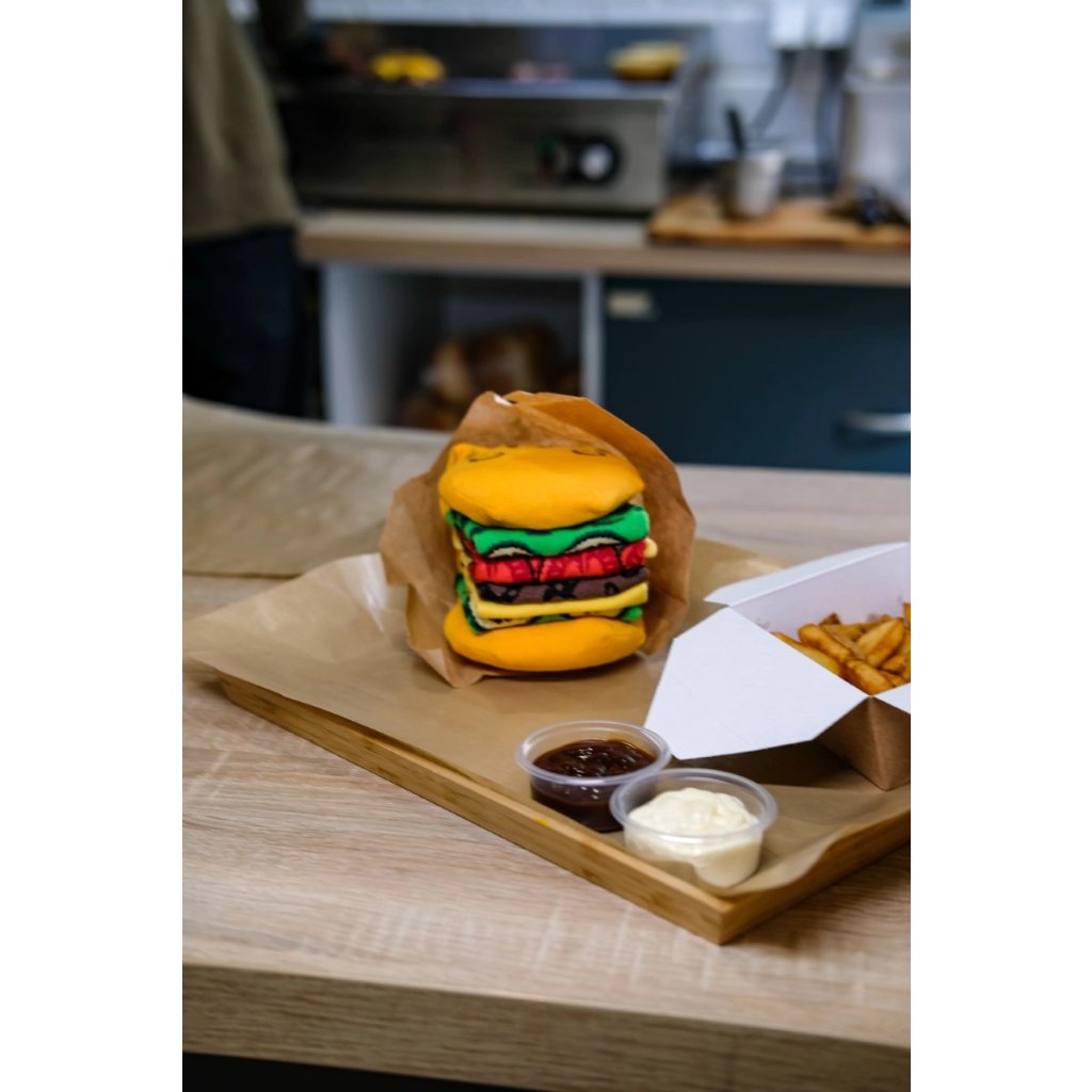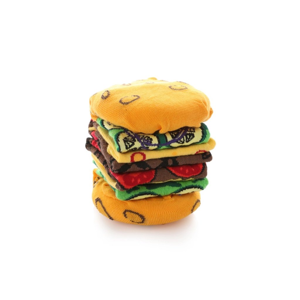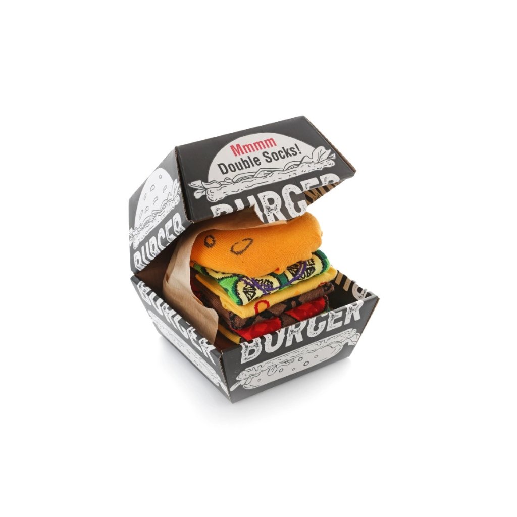 Hledáte dárek, který vyvolá úsměv a zároveň bude praktický? Ponožky s burgerovým potiskem jsou výjimečný set, který spojuje pohodlí, teplo a originální design. V balení najdete dvě barevné páry ponožek. Celé je to zabaleno v designové krabičce, která připomíná pravé balení fast foodu!
