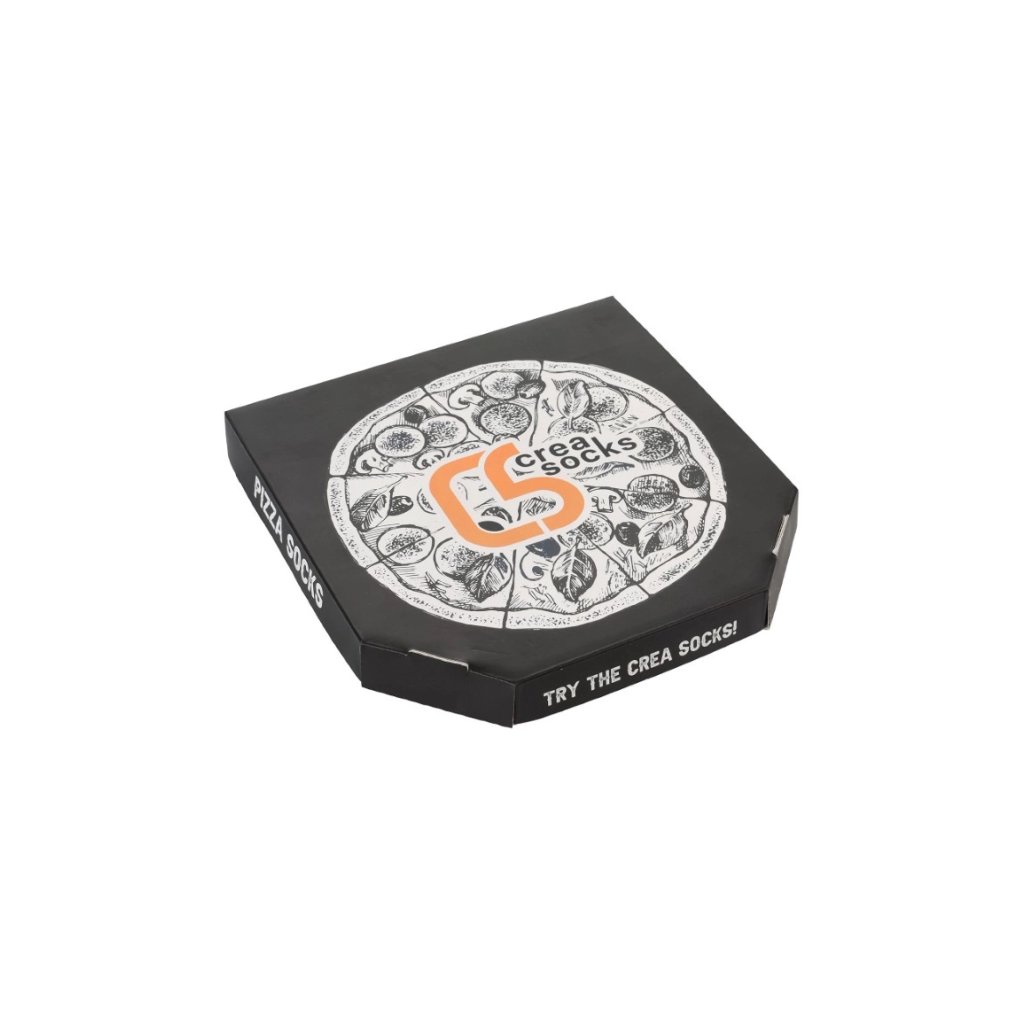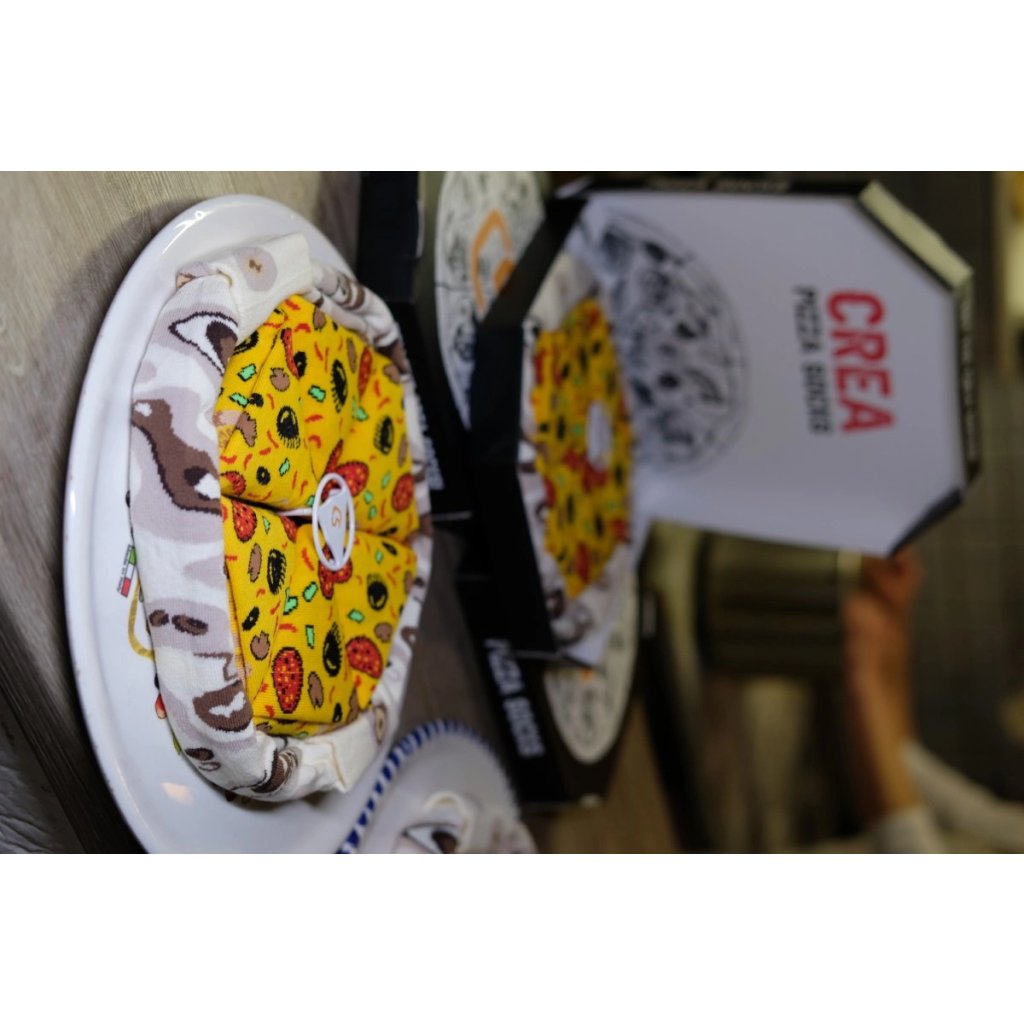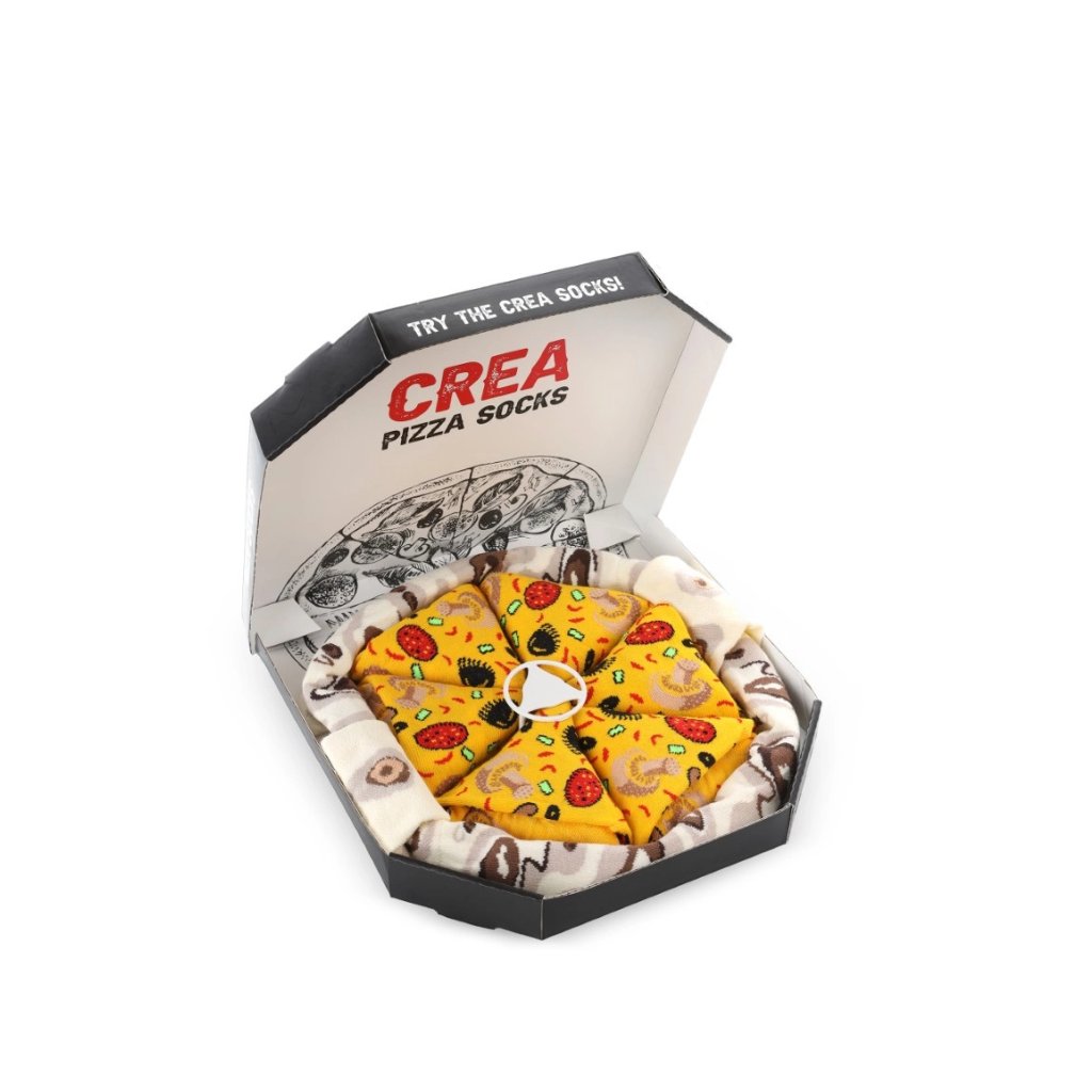Objednejte si pizzu... ale v textilní verzi! Tady jsou výjimečné ponožky zabalené jako pravá pizza – ve stylové kartonové krabičce připomínající obal z pizzerie. V sadě se nacházejí čtyři páry barevných ponožek.