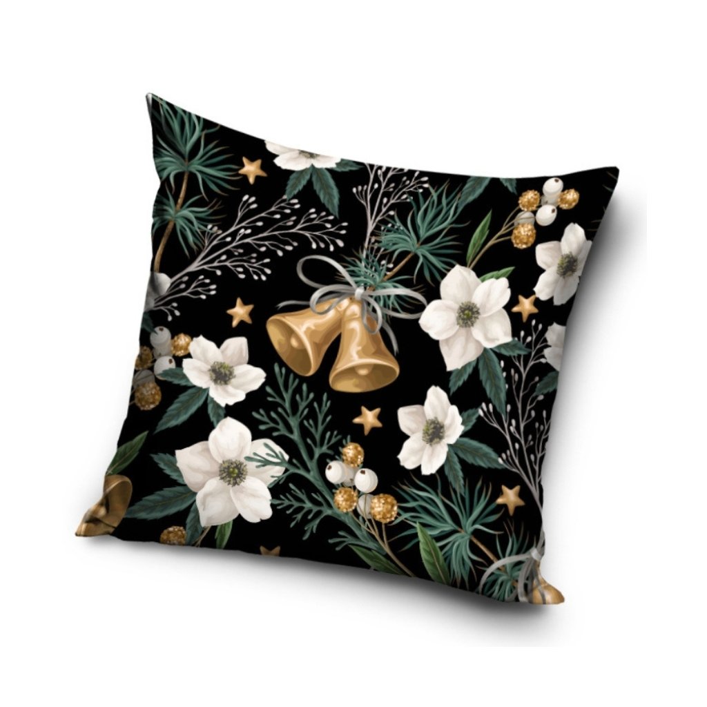 Na černém povláčku jsou bílé květinky které doplňují zelené větvičky a zlaté zvonečky