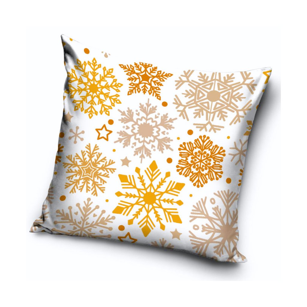 Povlak zdobí elegantní motiv zlatých a béžových sněhových vloček, které jsou rozprostřeny po sněhově bílém podkladu