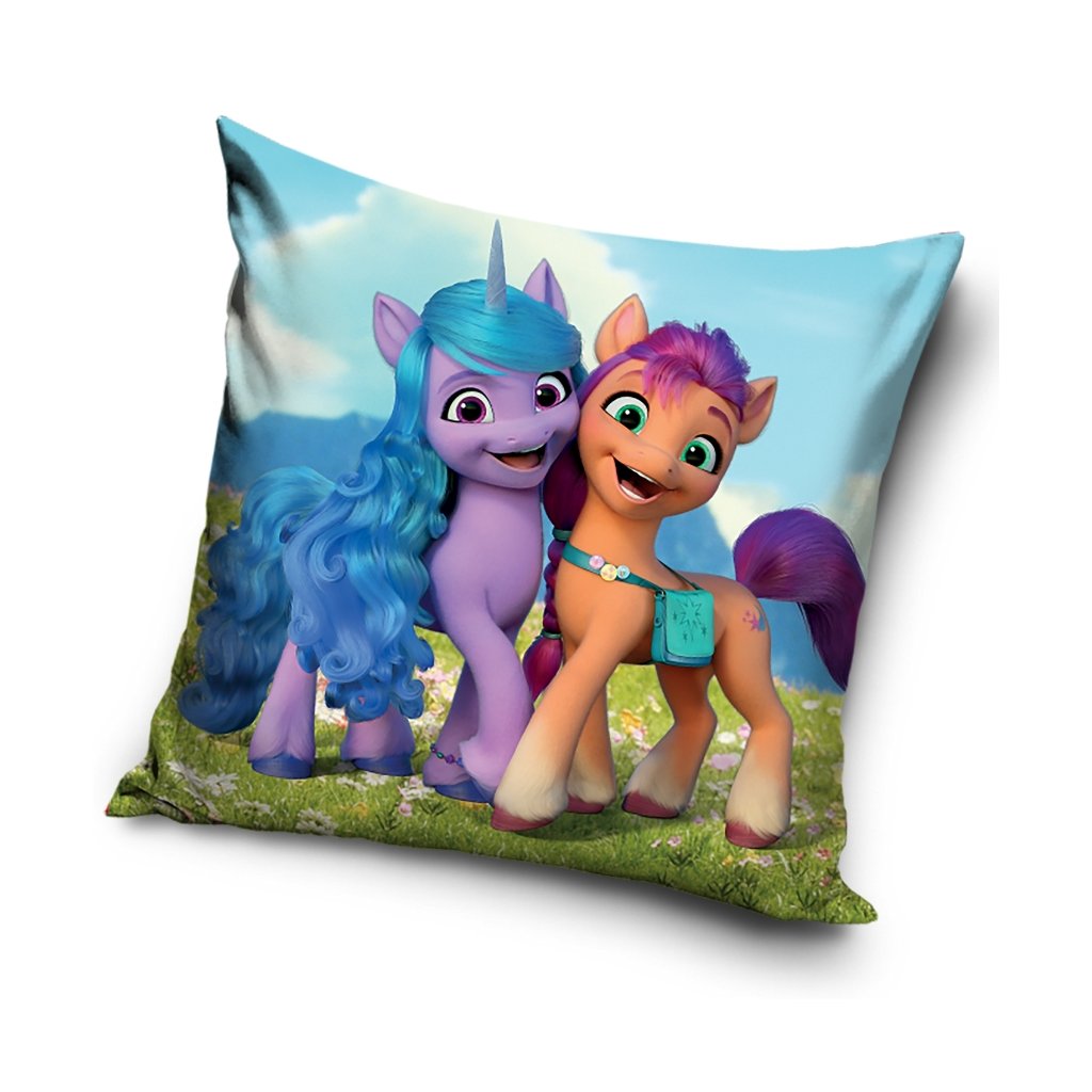 Na obou stranách povlaku je stejný motiv – dvě nejlepší kamarádky ze světa My Little Pony, fialová jednorožka Izzy Moonbow a oranžová klisnička Sunny Starscout, se usmívají a objímají na rozkvetlé louce pod modrou oblohou