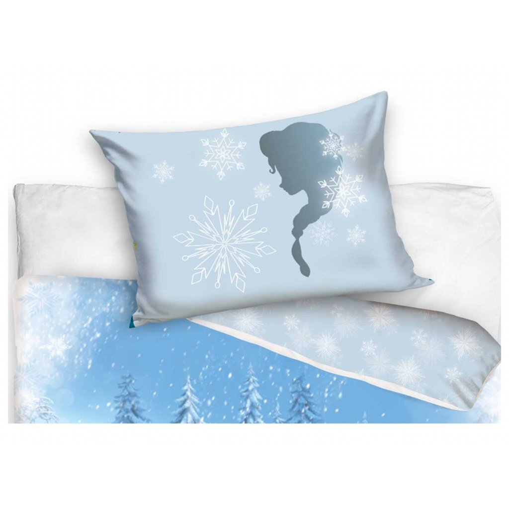 Vneste do dětské postýlky zimní pohádku s povlečením inspirovaným filmem Ledové království. Přikrývku zdobí Elsa, Anna, Kristoff, Olaf a Sven stojící na zasněžené krajině s lesem v pozadí. Polštář má světle modrou barvu s vločkami a siluetou Elsy, což vytváří harmonický a kouzelný vzhled celého setu.