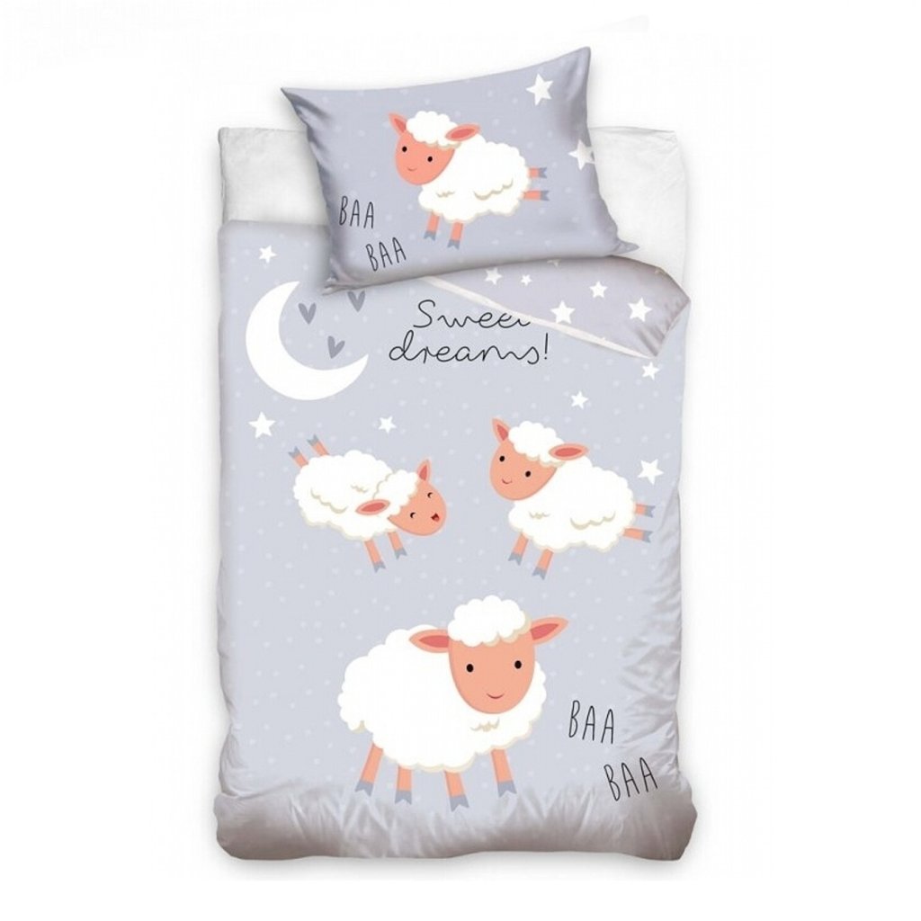 Povlečení má světle šedou barvu s drobnými bílými puntíky, které tvoří pozadí. Na povrchu jsou tři roztomilé bílé ovečky s růžovými tvářemi a ušima, které vypadají jako by skákaly po obloze. Nad nimi je nápis „Sweet dreams!“ napsaný černým písmem. V horní části povlečení je také bílý měsíc a několik hvězdiček, které dodávají celkovému designu kouzelnou atmosféru. Na polštáři se nachází jedna ovečka a nápis „BAA BAA“ opakující se dvakrát vedle ní.