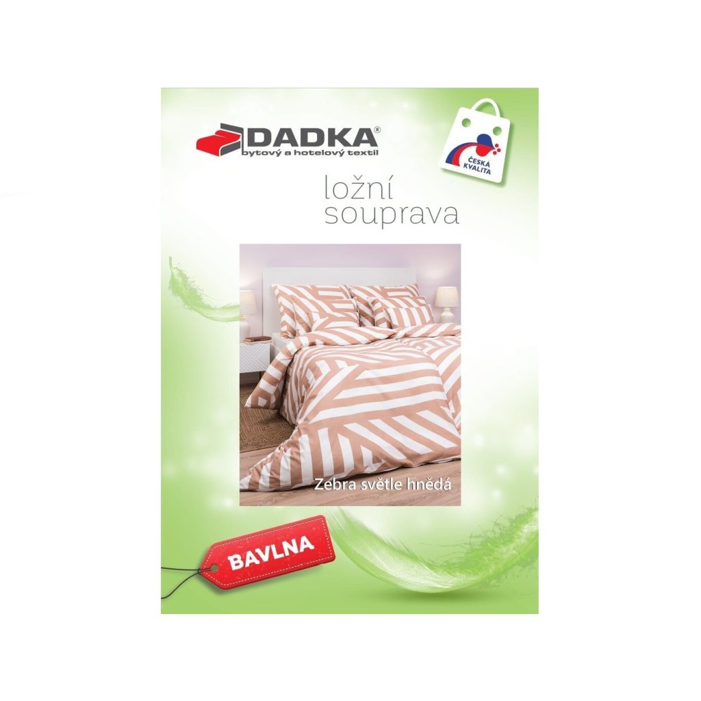 Stylové ložní prádlo Zebra světle hnědá přináší do vaší ložnice harmonii přírody a jemný nádech exotiky. Vzor inspirovaný zebří srstí v odstínech světle hnědé a bílé působí klidně a zároveň originálně. Tento decentní, ale výrazný design doporučujeme kombinovat s prostěradly ve světle hnědé, bílé nebo banánové barvě. Vyrobeno v České republice firmou DADKA VRACOV.