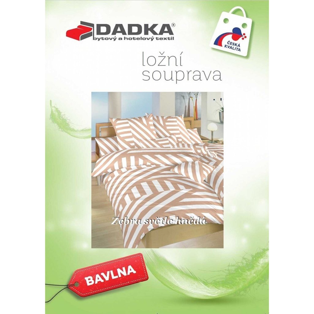 Stylové ložní prádlo Zebra světle hnědá přináší do vaší ložnice harmonii přírody a jemný nádech exotiky. Vzor inspirovaný zebří srstí v odstínech světle hnědé a bílé působí klidně a zároveň originálně. Tento decentní, ale výrazný design doporučujeme kombinovat s prostěradly ve světle hnědé, bílé nebo banánové barvě. Vyrobeno v České republice firmou DADKA VRACOV.