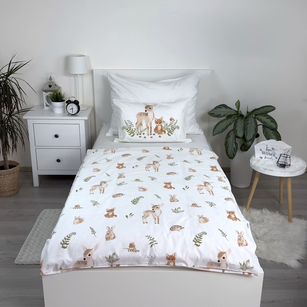Roztomilé povlečení s motivem lesních zvířátek přinese do dětského pokojíčku klidnou a přátelskou atmosféru. Přikrývku i polštář zdobí ilustrace srnečků, lišek a ježků v různých pozicích, doplněné jemnými zelenými lístky a větvičkami. Harmonický design v pastelových barvách potěší každého malého milovníka přírody.