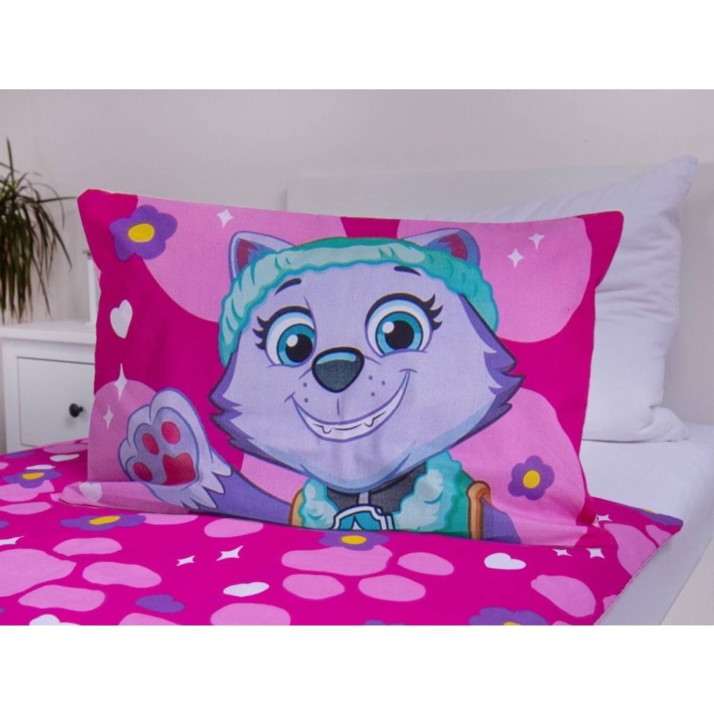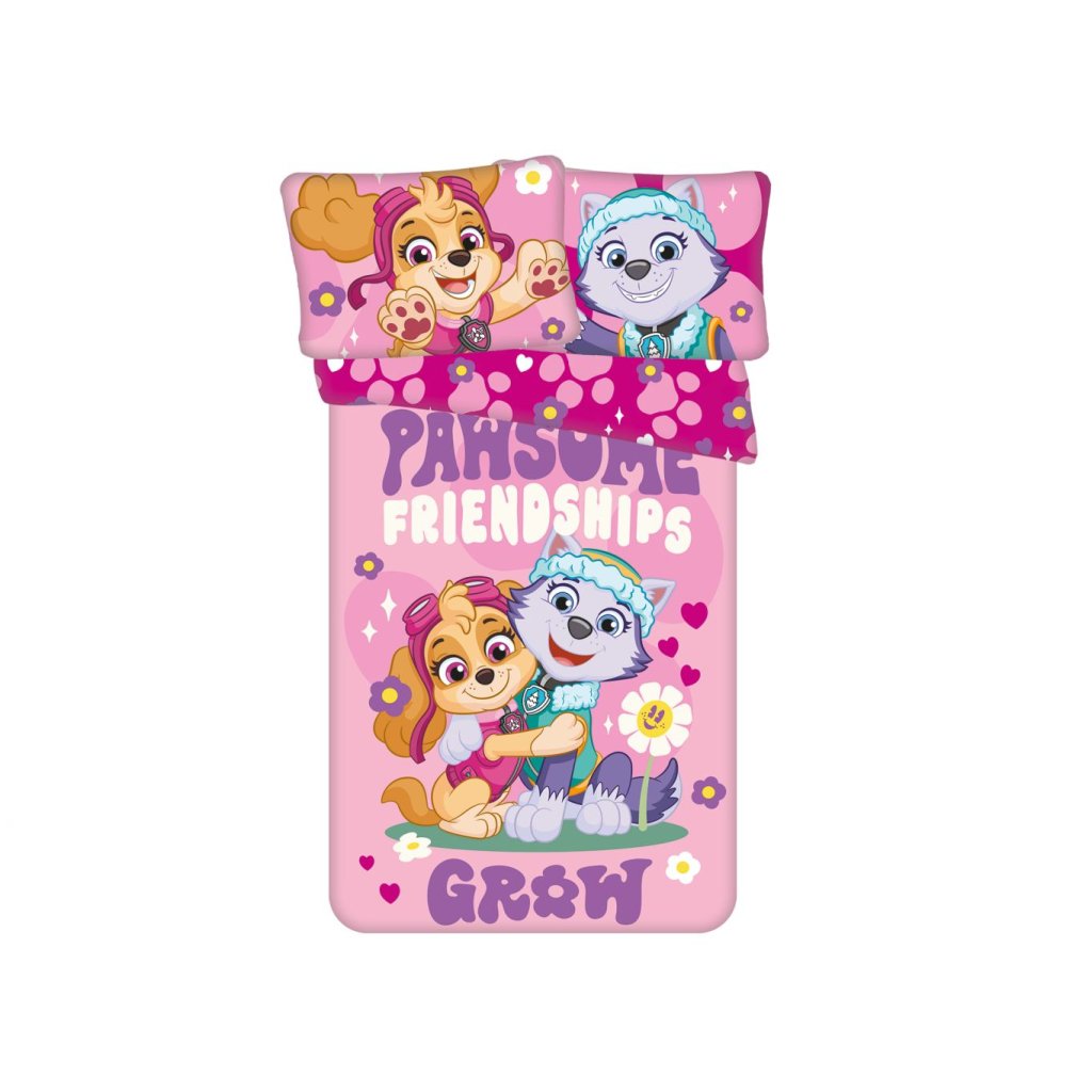 Roztomilé povlečení s motivem Skye a Everest z Tlapkové patroly na růžovém pozadí s květinami potěší každou malou faninku. Nápis „Pawsome Friendships Grow“ dodává povlečení pozitivní nádech.