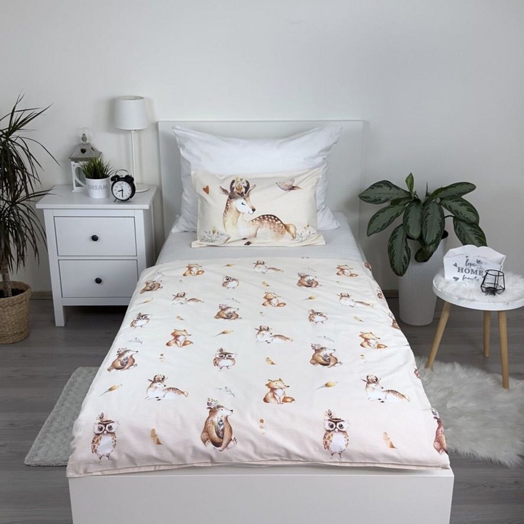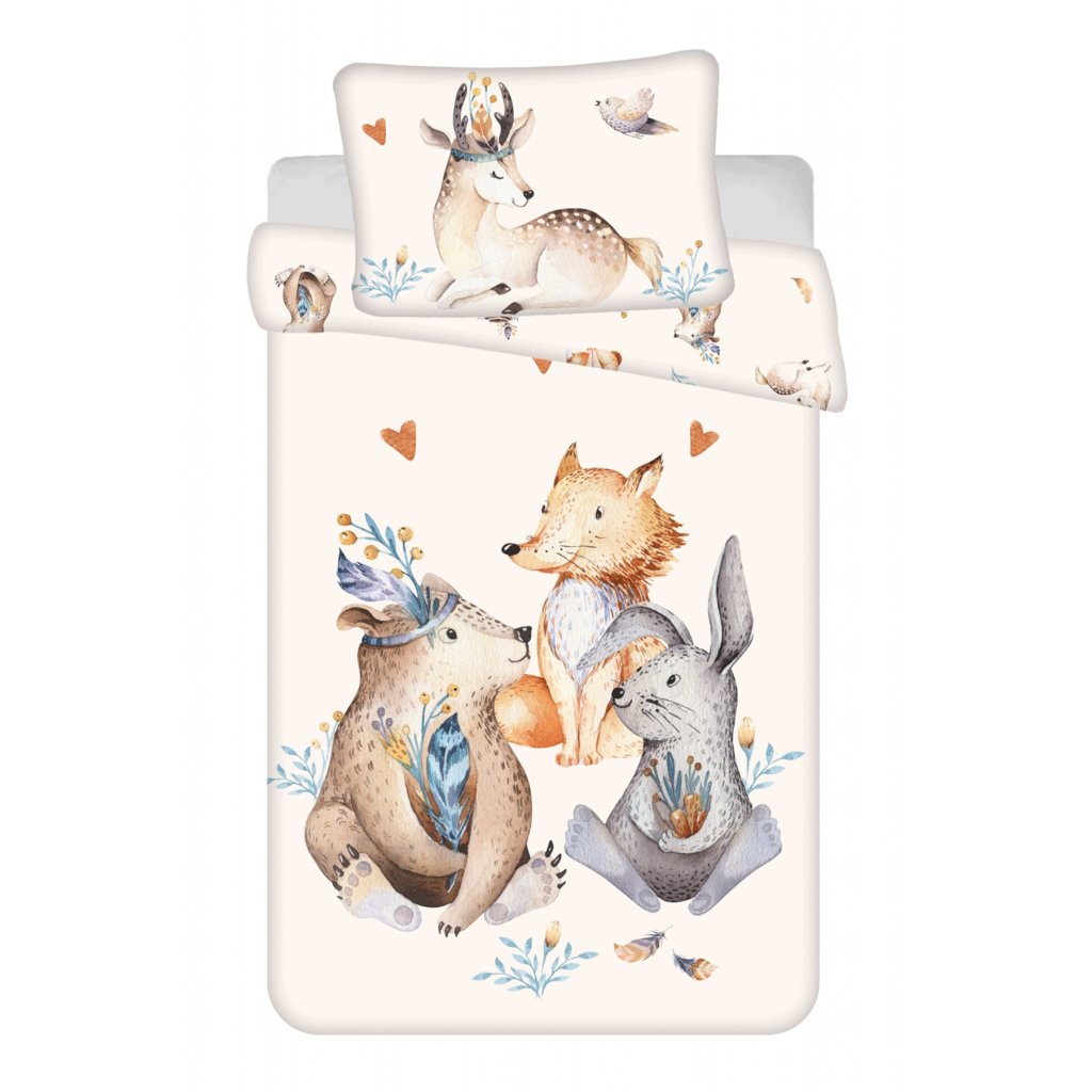 Na povlečení jsou vyobrazeni přátelští obyvatelé lesa – medvídek, liška, zajíc a srnka, kteří společně tvoří harmonickou a veselou scénu. Jemné pastelové barvy a detailní ilustrace zvířátek doplněné o drobné květinové prvky a srdíčka vytvářejí útulnou atmosféru pro klidný spánek vašeho dítěte.