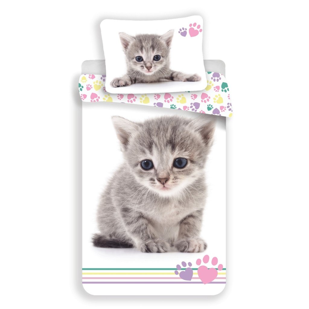 Dopřejte svému dítěti spánek plný něhy s povlečením, které si zamiluje každý malý milovník koček. Povlak na polštář zdobí realistický obrázek šedého kotěte s modrýma očima, doplněný o růžové a fialové tlapičky. Přikrývka zaujme velkým obrázkem kotěte uprostřed a veselými barevnými pruhy a tlapkami ve spodní části. Okraje přikrývky lemují pastelové tlapičky v růžové, žluté, zelené a fialové barvě, které dodávají celému setu hravý a přívětivý vzhled.